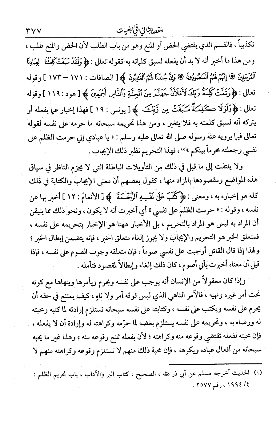 ولا يلتفت إلى ما قيل في ذلك من التأويلات الباطلة، التي لا يجزم الناظر في سياق هذه المواضع ومقصودها بالمراد منها، كقول بعضهم: إن معنى الإيجاب والكتابة في ذلك كله هو إخباره به، ومعنى كتب ربكم على نفسه الرحمة أخبر بها عن نفسه، وقوله: «حرمت الظلم على نفسي» أي أخبرت أنه لا يكون، ونحو ذلك مما يتيقن أن المراد به ليس هو المراد بالتحريم، بل الإخبار هاهنا هو الإخبار بتحريمه وإيجابه على نفسه، فمتعلق الخبر هو التحريم والإيجاب، ولا يجوز إلغاء متعلق الخبر، فإنه يتضمن إبطال الخبر. ولهذا إذا قال القائل: أوجبت على نفسي صوما، فإن متعلقه وجوب الصوم على نفسه، فإذا قيل: إن معناه أخبرت بأني أصوم، كان ذلك إلغاء وإبطالا لمقصود الخبر فتأمله. وإذا كان معقولا من الإنسان أنه يوجب على نفسه ويحرم ويأمرها وينهاها مع كونه تحت أمر غيره ونهيه، فالآمر الناهي الذي ليس فوقه آمر ولا ناه كيف يمتنع في حقه أن يحرم على نفسه ويكتب على نفسه؟ وكتابته على نفسه سبحانه تستلزم إرادته لما كتبه ومحبته له ورضاه به، وتحريمه على نفسه يستلزم بغضه لما حرمه وكراهته له وإرادة أن لا يفعله، فإن محبته لفعله تقتضي وقوعه منه، وكراهته لأن يفعله تمنع وقوعه منه، وهذا غير ما يحبه سبحانه من أفعال عباده ويكرهه، فإن محبته ذلك منهم لا تستلزم وقوعه، وكراهته منهم لا