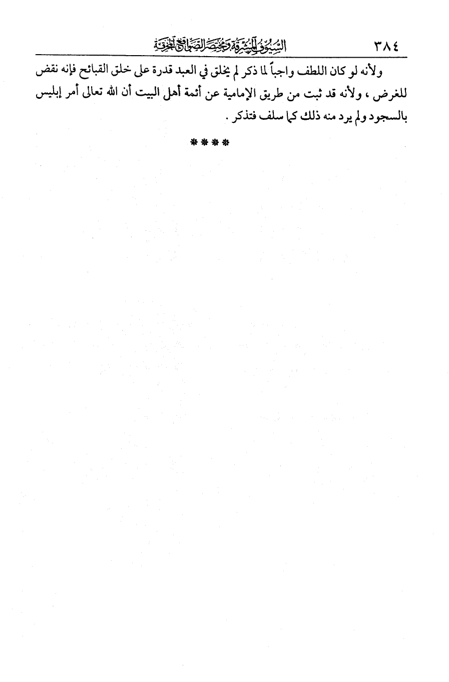 ولأنه لو كان اللطف واجبا لما ذكر لم يخلق في العبد قدرة على خلق القبائح، فإنه نقض للغرض. ولأنه قد ثبت من طريق الإمامية عن أئمة أهل البيت أن الله تعالى أمر إبليس بالسجود ولم يرد منه ذلك كما سلف فتذكر.