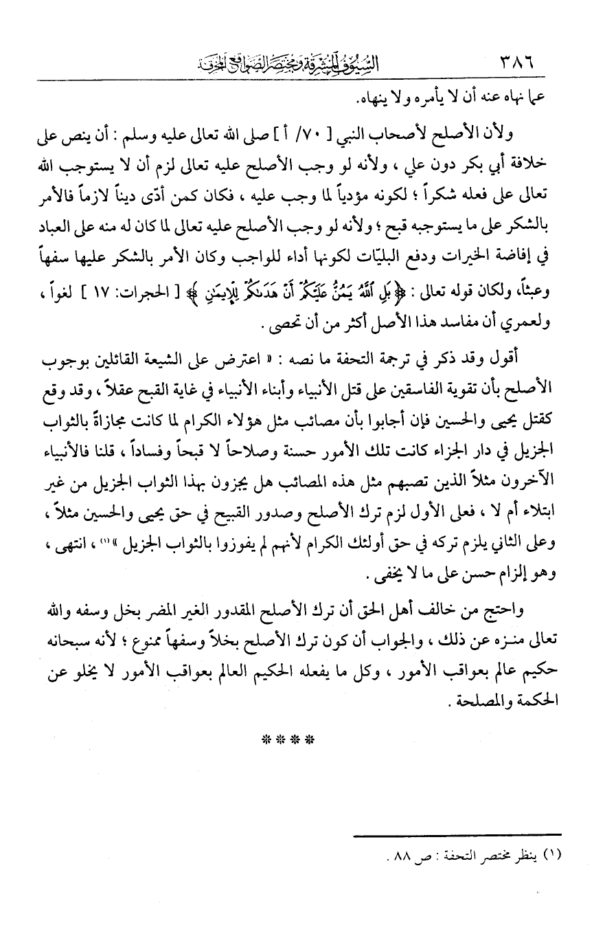 أقول: وقد ذكر في ترجمة التحفة ما نصه: "اعترض على الشيعة القائلين بوجوب الأصلح بأن تقوية الفاسقين على قتل الأنبياء وأبناء الأنبياء في غاية القبح عقلا، وقد وقع، كقتل يحيى والحسين؛ فإن أجابوا بأن مصائب مثل هؤلاء الكرام لما كانت مجازاة بالثواب الجزيل في دار الجزاء كانت تلك الأمور حسنة وصلاحا، لا قبحا وفسادا؛ قلنا: فالأنبياء الآخرون مثلا الذين لم تصبهم مثل هذه المصائب، هل يجزون بهذا الثواب الجزيل من غير ابتلاء أم لا؟ فعلى الأول لزم ترك الأصلح وصدور القبيح في حق يحيى والحسين مثلا، وعلى الثاني يلزم تركه في حق أولئك الكرام، لأنهم لم يفوزوا بالثواب الجزيل" انتهى، وهو إلزام حسن على ما لا يخفى.