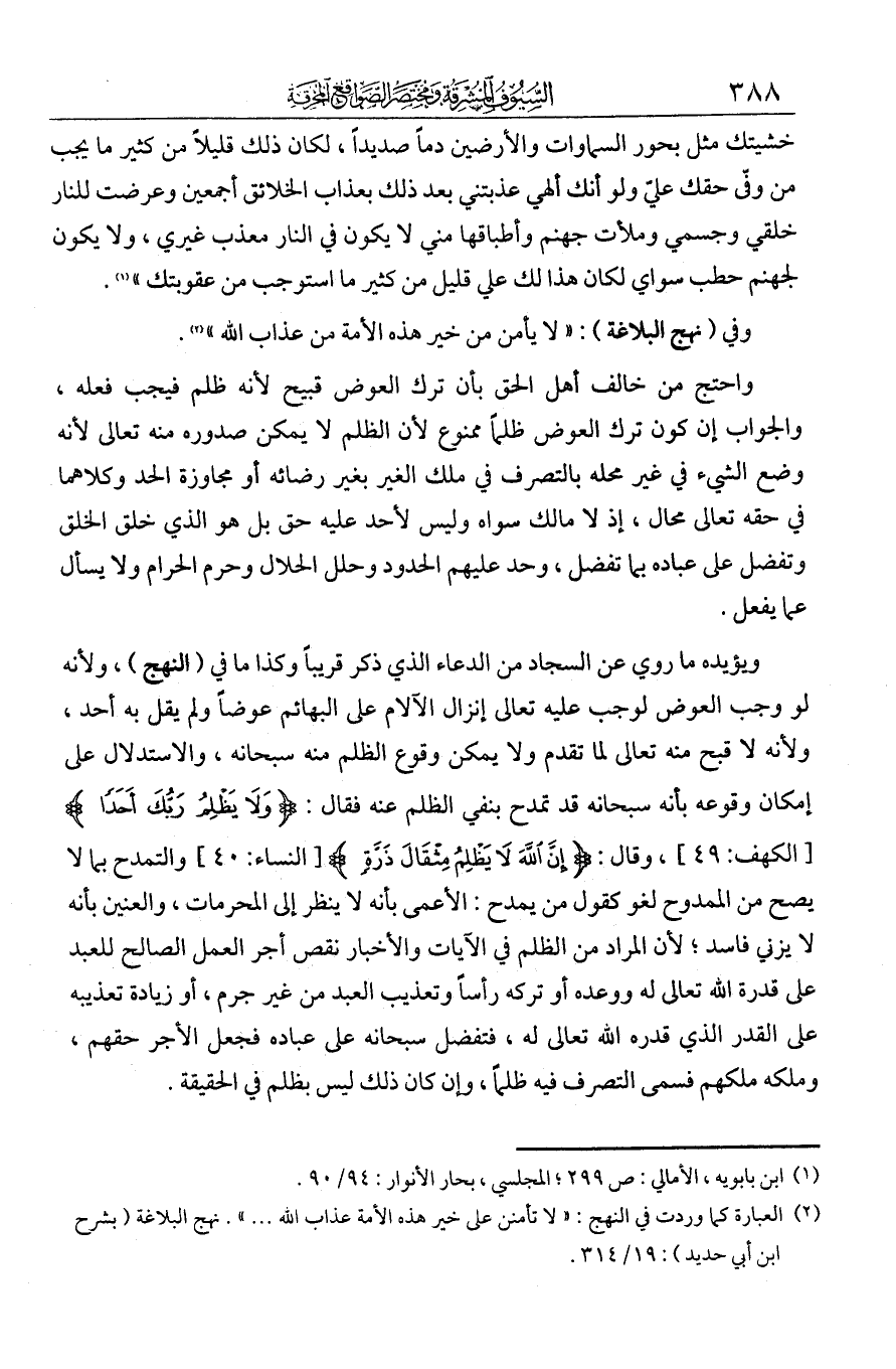والجواب أن كون ترك العوض ظلما ممنوع، لأن الظلم لا يمكن صدوره منه تعالى؛ لأنه وضع الشيء في غير محله، بالتصرف في ملك الغير بغير رضاه، أو مجاوزة الحد، وكلاهما في حقه تعالى محال، إذ لا مالك سواه، وليس لأحد عليه حق. بل هو الذي خلق الخلق، وتفضل على عباده بما تفضل، وحد عليهم الحدود، وحلل الحلال وحرم الحرام، ولا يسأل عما يفعل. ويؤيده ما روي عن السجاد من الدعاء الذي ذكر قريبا، وكذا ما في النهج. ولأنه لو وجب العوض لوجب عليه تعالى إنزال الآلام على البهائم عوضا، ولم يقل به أحد. ولأنه لا قبح منه تعالى لما تقدم، ولا يمكن وقوع الظلم منه سبحانه. والاستدلال على إمكان وقوعه بأنه سبحانه قد تمدح بنفي الظلم عنه فقال: {ولا يظلم ربك أحدا} وقال: {إن الله لا يظلم مثقال ذرة} والتمدح بما لا يصح من الممدوح لغو، كقول من يمدح الأعمى: بأنه لا ينظر إلى المحرمات، والعنين: بأنه لا يزني؛ فاسد؛ لأن المراد من الظلم في الآيات والأخبار نقص أجر العمل الصالح للعبد على ما قدره الله تعالى له ووعده، أو تركه رأسا، وتعذيب العبد من غير جرم، أو زيادة تعذيبه على القدر الذي قدره الله تعالى له، فتفضل سبحانه على عباده فجعل الأجر حقهم، وملكا ملكهم، فسمى التصرف فيه ظلما، وإن كان ذلك ليس بظلم في الحقيقة.