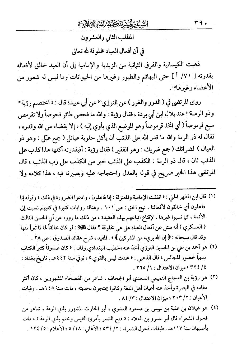 ذهبت الكيسانية والفرق الثمانية من الزيدية والإمامية إلى أن العبد خالق لأفعاله بقدرته، حتى البهائم والطيور وغيرها من الحيوانات وما ليس له شعور من الأعضاء وغيرها. روى المرتضى في الدرر والغرر عن التوزي عن أبي عبيدة قال: اختصم رؤبة وذو الرمة عند بلال بن أبي بردة، فقال رؤبة: والله ما فحص طائر فحوصا ولا تقرمص سبع قرموصا (أي اتخذ قرموصا وهو الموضع الذي يأوي إليه) إلا بقضاء من الله وقدره، فقال له ذو الرمة: والله ما قدر الله على الذئب أن يأكل حلوبة عيائل (جمع عيل، وهو ذو العيال) ضرائك (جمع ضريك، وهو الفقير)، فقال رؤبة: أفبقدرته أكلها؟ هذا كذب على الذئب ثان، قال ذو الرمة: الكذب على الذئب خير من الكذب على رب الذئب. قال المرتضى: هذا الخبر صريح في قوله بالعدل واحتجاجه عليه وبصيرته فيه. هذا كلامه، ولا