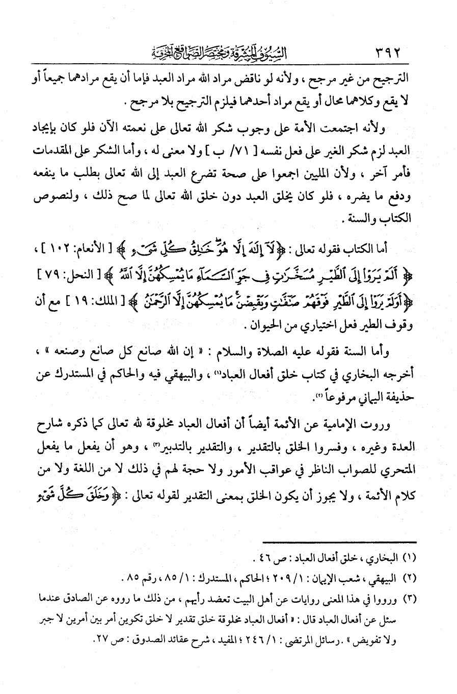 الترجيح من غير مرجح. ولأنه لو ناقض مراد الله مراد العبد: فإما أن يقع مرادهما جميعا، أو لا يقع، وكلاهما محال، أو يقع مراد أحدهما، فيلزم الترجيح بلا مرجح. ولأنه أجمعت الأمة على وجوب شكر الله تعالى على نعمته الآن، فلو كان بإيجاد العبد لزم شكر الغير على فعل نفسه، ولا معنى له، وأما الشكر على المقدمات فأمر آخر. ولأن المليين أجمعوا على صحة تضرع العبد إلى الله تعالى بطلب ما ينفعه ودفع ما يضره، فلو كان بخلق العبد دون خلق الله تعالى لما صح ذلك.
