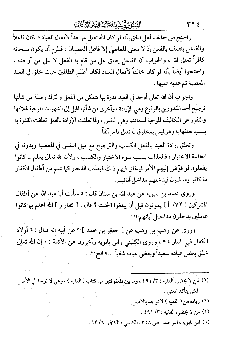 روى محمد بن بابويه عن عبد الله بن سنان قال: سألت أبا عبد الله عن أطفال المشركين يموتون قبيل أن يبلغوا الحنث، قال: "الله أعلم بما كانوا عاملين، يدخلون مداخل آبائهم". وروى عن وهب بن وهب عنه عن أبيه أنه قال: "أولاد الكفار في النار". وروى الكليني وابن بابويه وآخرون عن الأئمة: أن الله تعالى خلق بعض عباده سعيدا وبعض عباده شقيا.