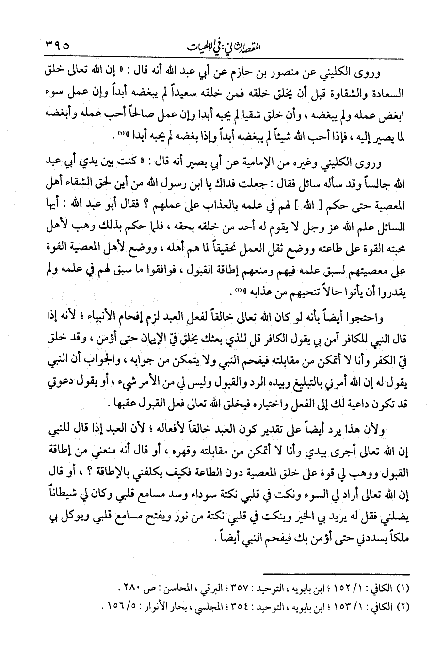 وروى الكليني عن منصور بن حازم عن أبي عبد الله أنه قال: "إن الله تعالى خلق السعادة والشقاوة قبل أن يخلق خلقه، فمن خلقه سعيدا لم يبغضه أبدا وإن عمل سوءا أبغض عمله ولم يبغضه، وإن خلق شقيا لم يحبه أبدا وإن عمل صالحا أحب عمله وأبغضه لما يصير إليه، فإذا أحب الله شيئا لم يبغضه أبدا، وإذا أبغضه لم يحبه أبدا". وروى الكليني وغيره من الإمامية عن أبي نصير أنه قال: كنت بين يدي أبي عبد الله جالسا وقد سأله سائل فقال: جعلت فداك يا ابن رسول الله، من أين لحق الشقاء أهل المعصية حتى حكم لهم في علمه بالعذاب على عملهم؟ فقال أبو عبدا لله: أيها السائل، علم الله عز وجل لا يقوم له أحد من خلقه بحقه، فلما حكم بذلك وهب لأهل محبته القوة على طاعته ووضع ثقل العمل تحقيقا لما هم أهله، ووضع لأهل المعصية القوة على معصيتهم لسبق علمه فيهم، ومنعهم إطاقة القبول، فوافقوا ما سبق لهم في علمه، ولم يقدروا أن يأتوا حالا تنجيهم من عذابه".