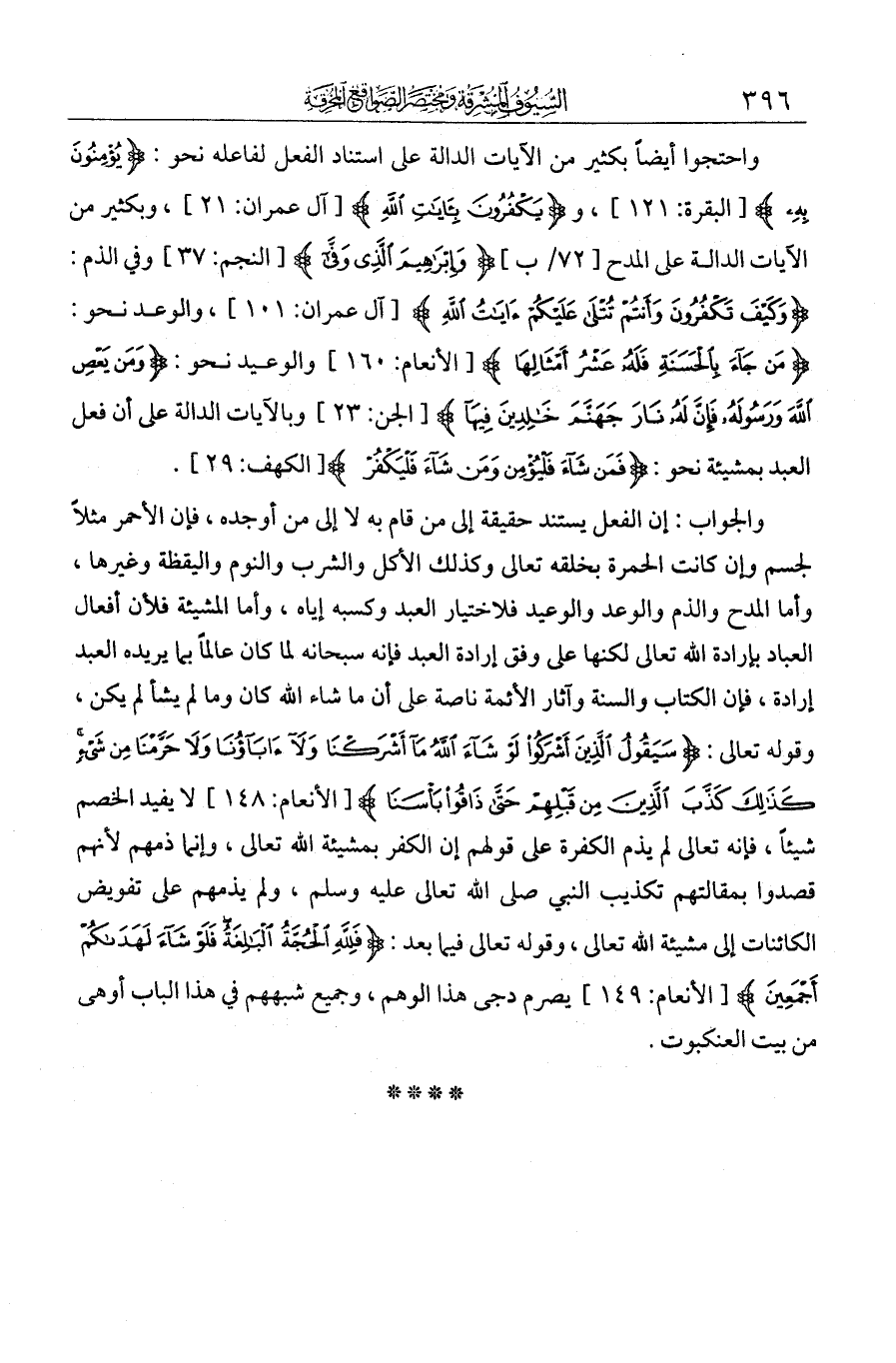 واحتجوا أيضا بكثير من الآيات الدالة على استناد الفعل لفاعله، نحو: {يؤمنون به}، {يكفرون بآيات الله} وبكثير من الآيات الدالة على المدح نحو: {وإبراهيم الذي وفى} وفي الذم نحو: {وكيف تكفرون بالله وأنتم تتلى عليكم آيات الله} والوعد نحو: {من جاء بالحسنة فله عشر أمثالها} والوعيد نحو: {ومن يعص الله ورسوله فإن له نار جهنم خالدين فيها أبدا} وبالآيات الدالة على أن فعل العبد بمشيئته، نحو: {فمن شاء فليؤمن ومن شاء فليكفر}.