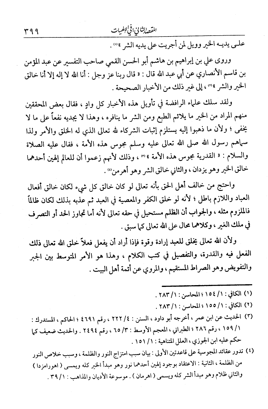 ولقد سلك علماء الرافضة في تأويل هذه الأخبار كل واد. فقال بعض المحققين منهم: "المراد من الخير ما يلائم الطبع، ومن الشر ما ينافره"، وهذا لا يجديه نفعا على ما لا يخفى. ولأن ما ذهبوا إليه يستلزم إثبات الشركاء لله تعالى الذي له الخلق والأمر، ولذا سماهم رسول الله - صلى الله عليه وسلم - مجوس هذه الأمة، فقال عليه الصلاة والسلام: «القدرية مجوس هذه الأمة»، وذلك لأنهم زعموا أن للعالم إلهين: أحدهما خالق الخير وهو يزدان، والثاني خالق الشر وهو أهرمن.
