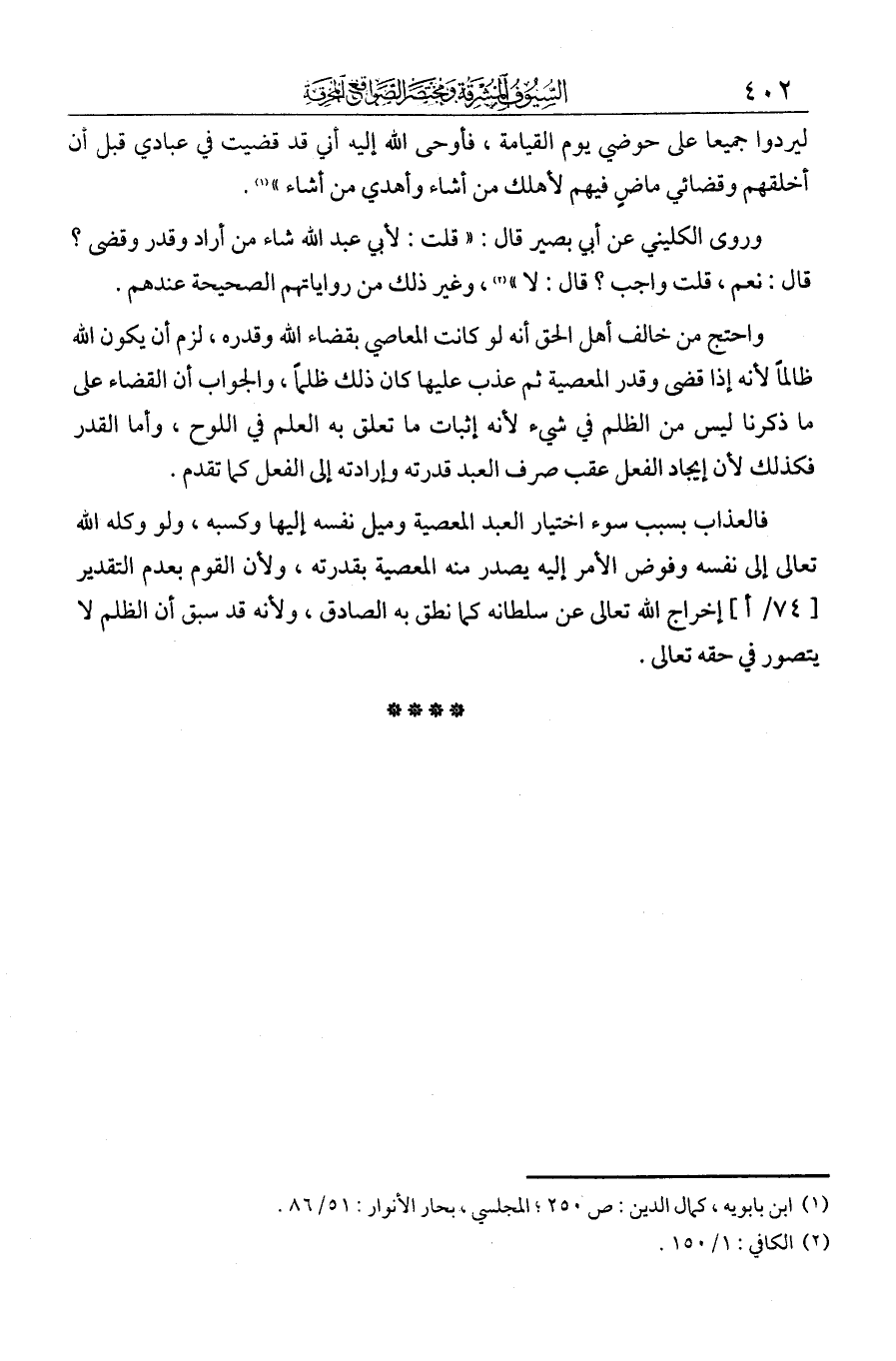 ليردوا جميعا على حوضي يوم القيامة، فأوحى الله إليه أني قد قضيت في عبادي قبل أن أخلقهم، وقضائي ماض فيهم، لأهلكن من أشاء، وأهدي به من أشاء". وروى الكليني عن أبي نصير قال: "قلت لأبي عبد الله: شاء من أراد وقدر وقضى؟ قال: نعم، قلت: وأحب؟ قال: لا". وغير ذلك من رواياتهم الصحيحة عندهم.