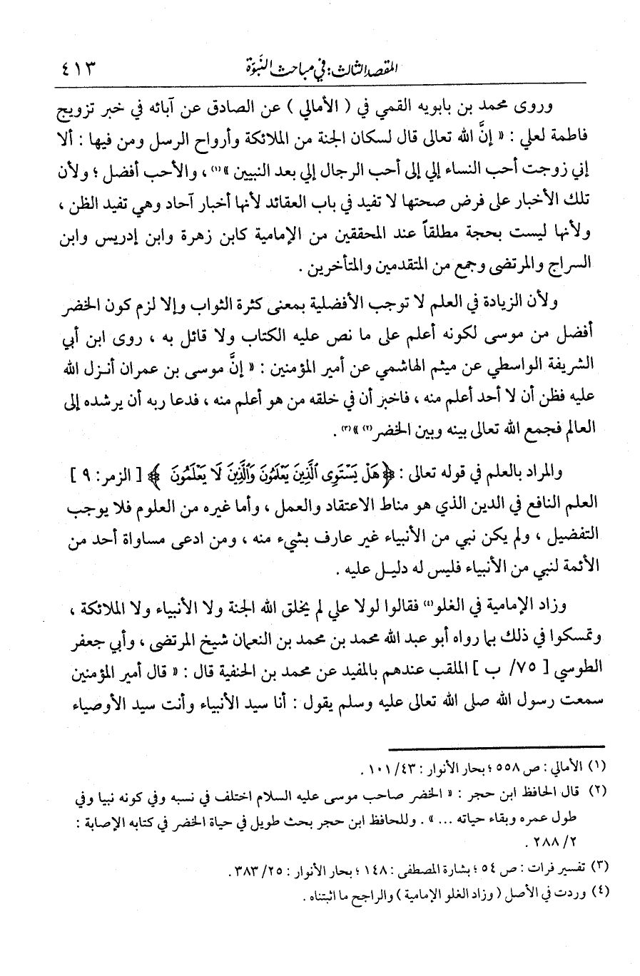 وروى محمد بن بابويه القمي في الأمالي عن الصادق عن آبائه في خبر تزويج فاطمة لعلي أن الله تعالى قال لسكان الجنة من الملائكة وأرواح الرسل ومن فيها: "ألا إني زوجت أحب النساء إلي أحب الرجال إلي بعد النبيين"، والأحب أفضل. ولأن تلك الأخبار على فرض صحتها لا تفيد في باب العقائد لأنها أخبار آحاد وهي تفيد الظن، ولأنها ليست بحجة مطلقا عند المحققين من الإمامية، كابن زهرة وابن إدريس وابن السراج والمرتضى وجمع من المتقدمين والمتأخرين. ولأن الزيادة في العلم لا توجب الأفضلية بمعنى كثرة الثواب، وإلا لزم كون خضر أفضل من موسى لكونه أعلم، على ما نص عليه الكتاب، ولا قائل به. روى ابن الشريفة الواسطي عن ميثم الهاشمي عن أمير المؤمنين: "أن موسى بن عمران أنزل الله عليه فظن أن لا أحد أعلم منه، فأخبر أن في خلقه من هو أعلم منه، فدعا ربه أن يرشده إلى العالم، فجمع الله تعالى بينه وبين خضر". والمراد بالعلم في قوله تعالى: {قل هل يستوي الذين يعلمون والذين لا يعلمون} العلم النافع في الدين، الذي هو مناط الاعتقاد والعمل. وأما غيره من العلوم فلا يوجب التفضيل، ولم يكن نبي من الأنبياء غير عارف بشيء منه. ومن ادعا مساواة أحد من الأئمة لنبي من الأنبياء فليس له دليل عليه.