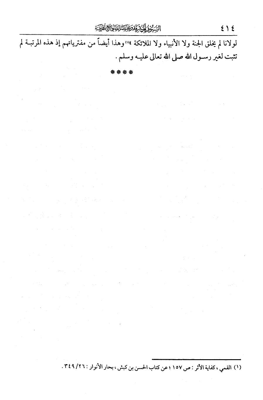 لولانا لم يخلق الجنة يا علي ولا الأنبياء ولا الملائكة". وهذا أيضا من مفترياتهم، إذ هذه المرتبة لم تثبت لغير رسول الله - صلى الله عليه وسلم -.