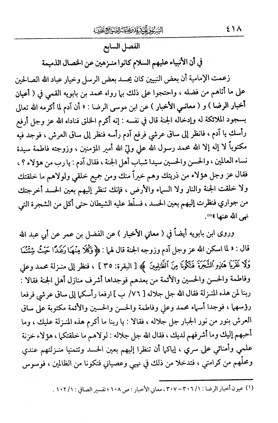 واحتجوا على ذلك بما رواه محمد بن بابويه القمي في أعيان أخبار الرضا ومعاني الأخبار عن ابن موسى الرضا: أن آدم لما أكرمه الله تعالى بسجود الملائكة له، وإدخاله الجنة قال في نفسه: أنا أكرم الخلق، فناداه الله عز وجل ارفع رأسك يا آدم فانظر إلى ساق عرشي، فرفع آدم رأسه فنظر إلى ساق العرش، فوجد فيه مكتوبا لا إله إلا الله، محمد رسول الله، علي ولي الله أمير المؤمنين، وزوجته فاطمة سيدة نساء العالمين، والحسن والحسين سيدا شباب أهل الجنة، فقال آدم: يا رب، من هؤلاء؟ فقال عز وجل: هؤلاء من ذريتك، وهم خير أمتك من جميع خلقي، ولولاهم ما خلقتك ولا خلقت الجنة والنار ولا السماء والأرض، فإنك إن تنظر إليهم بعين الحسد أخرجتك من جواري، فنظر إليهم بعين الحسد، فسلط عليه الشيطان حتى أكل من الشجرة التي نهى الله عنها. وروى ابن بابويه أيضا في معاني الأخبار عن الفضل بن عمر عن أبي عبد الله قال: لما أسكن الله عز وجل آدم وزوجه الجنة قال لهما: {وكلا منها رغدا حيث شئتما ولا تقربا هذه الشجرة فتكونا من الظالمين} فنظرا إلى منزلة محمد وعلي وفاطمة والحسن والحسين والأئمة من بعدهم، فوجداها أشرف منازل أهل الجنة، فقالا: ربنا لمن هذه المنزلة؟ فقال الله جل جلاله ارفعا رؤوسكما إلى ساق عرشي، فرفعا رؤوسهما، فوجدا أسماء محمد وعلي وفاطمة والحسن والحسين والأئمة مكتوبة على ساق العرش بنور من نور الجبار جل جلاله، فقالا: يا ربنا ما أكرم هذه المنزلة عليك وما أحبهم إليك وما أشرفهم لديك! فقال الله جل جلاله لولاهم ما خلقتكما، هؤلاء خزنة علمي وأمنائي على سري، إياكما أن تنظرا إليهم بعين الحسد وتتمنيا منزلتهم عندي ومحلهم من كرامتي، فتدخلا من ذلك في نهيي وعصياني، فتكونا من الظالمين، فوسوس