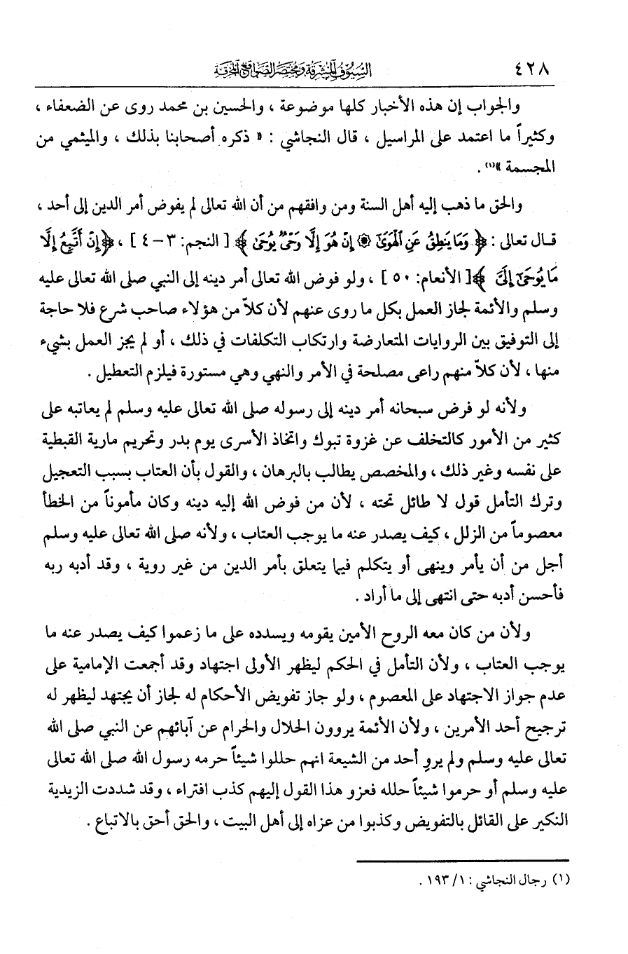 والحق ما ذهب إليه أهل السنة ومن وافقهم من أن الله تعالى لم يفوض أمر الدين إلى أحد، قال تعالى: {وما ينطق عن الهوى * إن هو إلا وحي يوحى}. ولو فوض الله تعالى أمر دينه إلى النبي - صلى الله عليه وسلم - والأئمة لجاز العمل بكل ما روي عنهم، لأن كلا من هؤلاء صاحب شرع، فلا حاجة إلى التوفيق بين الروايات المتعارضة وارتكاب التكلفات في ذلك، أو لم يجز العمل بشيء منها، لأن كلا منهم راعى مصلحة في الأمر والنهي، وهي مستورة، فيلزم التعطيل. ولأنه لو فوض سبحانه أمر دينه إلى رسوله - صلى الله عليه وسلم - لم يعاتبه على كثير من الأمور، [كالإذن بالتخلف] عن غزوة تبوك وإنجاز الأسرى يوم بدر وتحريم مارية القبطية على نفسه وغيرها، والمخصص يطالب بالبرهان. والقول بأن العتاب بسبب التعجيل وترك التأمل قول لا طائل تحته، لأن من فوض الله إليه دينه وكان مأمونا من الخطأ معصوما عن الزلل كيف يصدر عنه ما يوجب العتاب؟ ولأنه - صلى الله عليه وسلم - أجل من أن يأمر وينهى ويتكلم فيما يتعلق بأمر الدين من غير روية، وقد أدبه ربه فأحسن أدبه حتى انتهى إلى ما أراد. ولأن من كان معه الروح الأمين يقومه ويسدده -على ما زعموا- كيف يصدر عنه ما يوجب العتاب؟ ولأن التأمل في الحكم ليظهر الأولى اجتهاد، وقد أجمعت الإمامية على عدم جواز الاجتهاد على المعصوم، ولو جاز تفويض الأحكام له لجاز أن يجتهد، ليظهر له ترجيح أحد الأمرين. ولأن الأئمة يروون الحلال والحرام عن آبائهم عن النبي - صلى الله عليه وسلم -، ولم يرو أحد من الشيعة أنهم حللوا شيئا حرمه رسول الله - صلى الله عليه وسلم - أو حرموا شيئا حلله. فعزو هذا القول إليهم كذب وافتراء. وقد شددت الزيدية النكير على القائل بالتفويض، وكذبوا من عزاه إلى أهل البيت. والحق أحق بالاتباع.