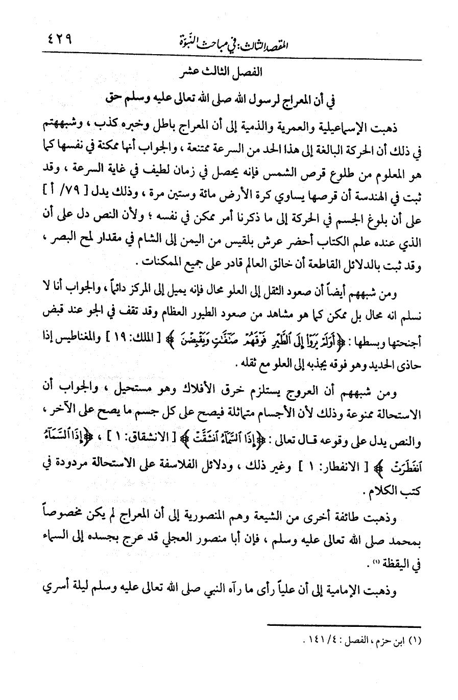 والجواب أنها ممكنة في نفسها، كما هو المعلوم من طلوع قرص الشمس، فإنه يحصل في زمان لطيف في غاية السرعة. وقد ثبت في الهندسة أن قرصها يساوي كرة الأرض مئة وستين مرة، وذلك يدل على أن بلوغ الجسم في الحركة إلى ما ذكرنا أمر ممكن في نفسه، ولأن النص دل على أن الذي عنده علم من الكتاب أحضر عرش بلقيس من اليمن إلى الشام في مقدار لمح البصر، وقد ثبت بالدلائل القاطعة أن خالق العالم قادر على جميع الممكنات. ومن شبههم أيضا أن صعود الثقيل إلى العلو محال فإنه يميل إلى المركز دائما. والجواب أنا لا نسلم أنه محال، بل هو ممكن كما هو مشاهد من صعود الطيور العظام، وقد تقف في الجو عند قبض أجنحتها وبسطها: {أولم يروا إلى الطير فوقهم صافات ويقبضن}، والمغناطيس إذا حاذى الحديد وهو فوقه يجذبه إلى العلو مع ثقله.