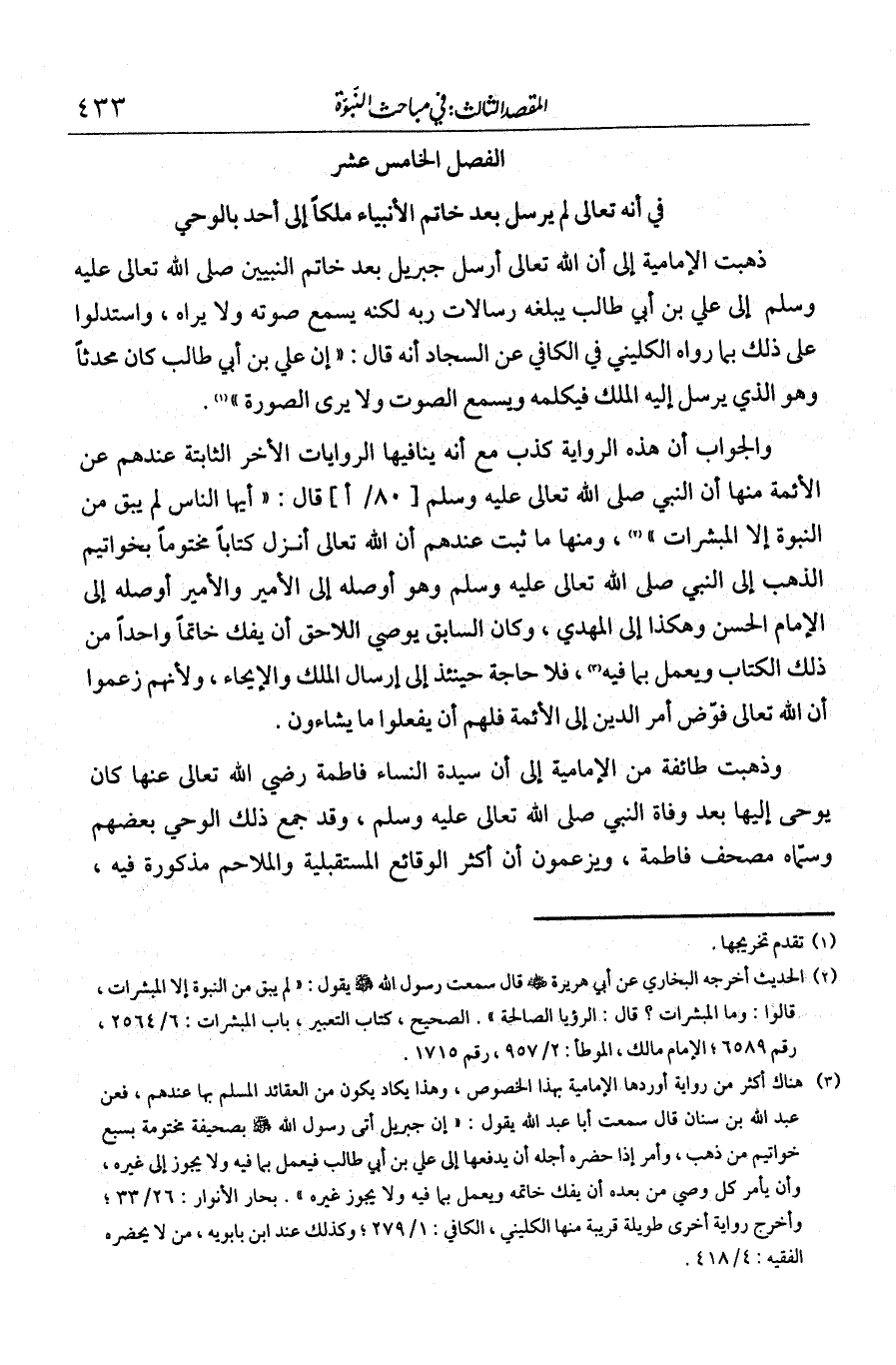 والجواب أن هذه الرواية كذب، مع أنه يناقضها الروايات الأخر الثابتة عندهم عن الأئمة. منها أن النبي - صلى الله عليه وسلم - قال: "أيها الناس، لم يبق بعدي من النبوة إلا المبشرات". ومنها ما ثبت عندهم: أن الله تعالى أنزل كتابا مختوما بخواتيم الذهب إلى النبي - صلى الله عليه وسلم - وهو أوصله إلى الأمير، والأمير أوصله إلى الإمام الحسن، وهكذا إلى المهدي، وكان السابق يوصي اللاحق أن يفك خاتما واحدا من ذلك الكتاب ويعمل بما فيه. فلا حاجة حينئذ إلى إرسال الملك والإيحاء. ولأنهم زعموا أن الله تعالى فوض أمر الدين إلى الأئمة، فلهم أن يفعلوا ما يشاءون.