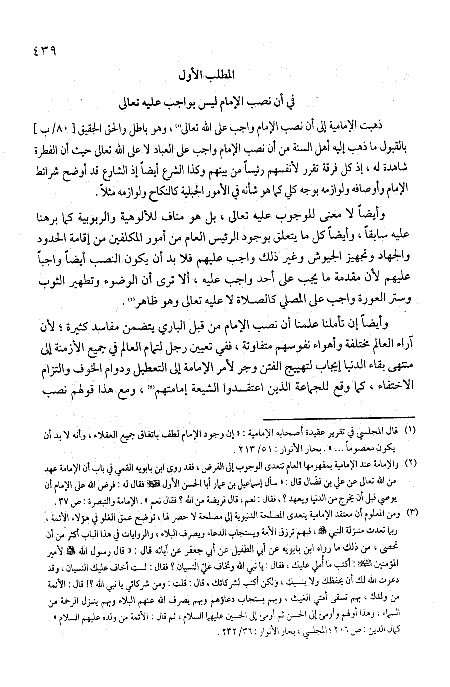 ذهبت الإمامية إلى أن نصب الإمام واجب على الله تعالى. وهو باطل. والحق الحقيق بالقبول ما ذهب إليه أهل السنة من أن نصب الإمام واجب على العباد لا على الله تعالى، حيث أن الفطرة شاهدة له، إذ كل فرقة تقرر لأنفسهم رئيسا من بينهم. وكذا الشرع أيضا، إذا الشارع قد أوضح شرائط الإمام وأوصافه ولوازمه بوجه كلي كما هو شأنه في الأمور الجبلية كالنكاح ولوازمه مثلا.