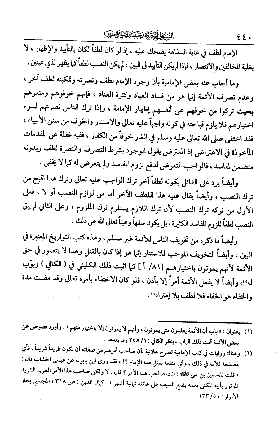 وأيضا ما ذكره من تخويف الناس للأئمة غير مسلم، وهذه كتب التواريخ المعتبرة في البين. وأيضا التخويف الموجب للاستتار إنما هو إذا كان بالقتل، وهذا لا يتصور في حق الأئمة لأنهم يموتون باختيارهم كما أثبت ذلك الكليني في الكافي وبوّب له. وأيضا لا يفعل الأئمة أمرا إلا بإذن، فلو كان الاختفاء بأمره تعالى وقد مضت مدة والخفاء هو الخفاء، فلا لطف بلا امتراء.