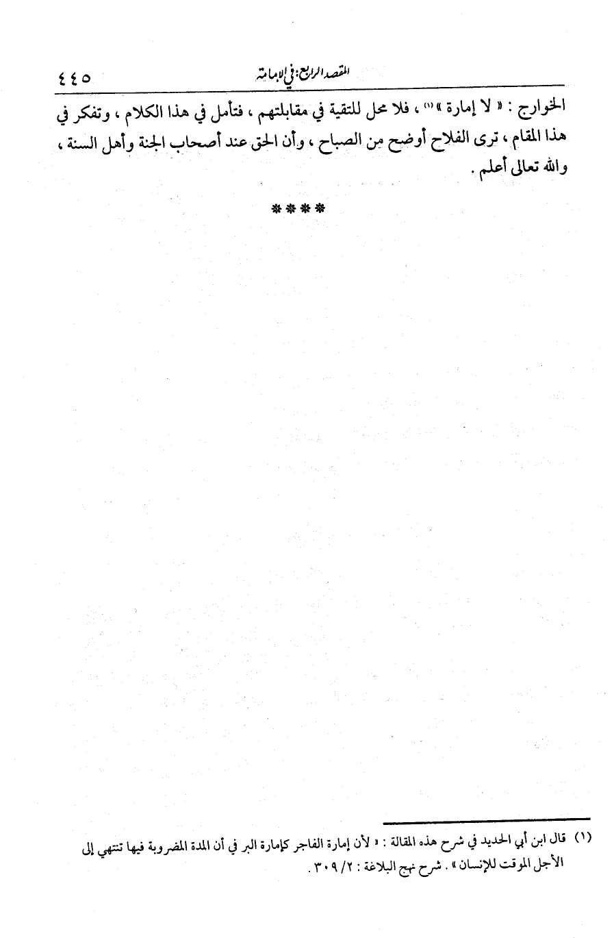 الخوارج: «لا إمارة» فلا محل للتقية في مقابلتهم، فتأمل في هذا الكلام وتفكر في هذا المقام، تر الفلاح أوضح من الصباح، وأن الحق عند أصحاب الجنة وأهل السنة. والله تعالى أعلم.