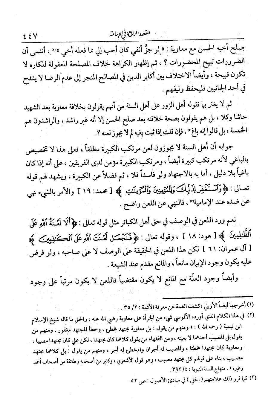 فإن قلت إذا ثبت بغيه لم لا يجوز لعنه؟ جوابه: إن أهل السنة لا يجوزون لعن مرتكب الكبيرة مطلقا، فعلى هذا لا تخصيص بالباغي لأنه مرتكب كبيرة أيضا، ومرتكب الكبيرة مؤمن لدى الفريقين، على أنه إذا كان باغيا بلا دليل. وأما كان بغيه بالاجتهاد ولو فاسد فلا إثم عليه فضلا عن الكبيرة. ويشهد لهم قوله تعالى: {واستغفر لذنبك وللمؤمنين والمؤمنات}. والأمر بالشيء نهي عن ضده عند الإمامية، فالنهي عن اللعن واضح.