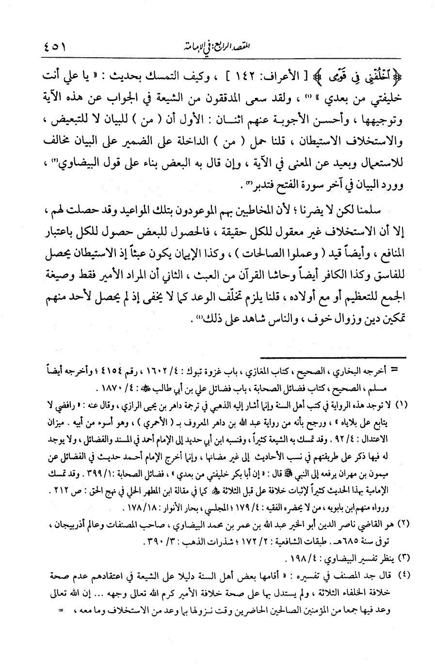 {اخلفني في قومي} وكيف التمسك بحديثهم: «يا علي أنت خليفتي من بعدي»؟ ولقد سعى المدققون من الشيعة في الجواب عن هذه الآية وتوجيهها. وأحسن الأجوبة عندهم اثنان: الأول أن «من» للبيان لا للتعبيض، و «الاستخلاف» الاستيطان. قلنا: حمل «من» الداخلة على الضمير على البيان مخالف للاستعمال وبعيد عن المعنى في الآية، وإن قال به البعض بناء على قول البيضاوي، وورد البيان في آخر سورة الفتح فتدبر. سلمنا، لكن لا يضرنا لأن المخاطبين هم الموعودون بتلك المواعيد وقد حصلت لهم، إلا أن الاستخلاف غير معقول للكل حقيقة، فالحصول للبعض حصول للكل باعتبار المنافع. وأيضا قيد {وعملوا الصالحات} وكذا «الإيمان» يكون عبثا، إذ الاستيطان يحصل للفاسق وكذا الكافر أيضا وحاشا القرآن من العبث. الثاني أن المراد الأمير فقط وصيغة الجمع للتعظيم أو مع أولاده بخوف. قلنا يلزم تخلف الوعد كما لا يخفى، إذ لم يحصل لأحد منهم تمكين دين وزوال خوف، والناس شاهدة على ذلك.