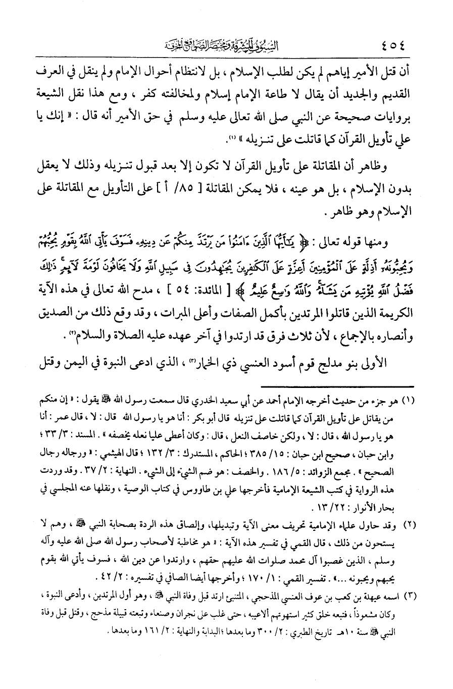 إن قتل الأمير إياهم لم يكن لطلب الإسلام بل لانتظام أحوال الإمام، ولم ينقل في العرف القديم والجديد أن يقال لإطاعة الإمام إسلام ولمخالفته كفر. ومع هذا نقل الشيعة روايات صحيحة عن النبي - صلى الله عليه وسلم - في حق الأمير أنه قال: "إنك يا علي تقاتل على تأويل القرآن كما قاتلت على تنزيله". وظاهر أن المقاتلة على تأويل القرآن لا تكون إلا بعد قبول تنزيله، وذلك لا يعقل بدون الإسلام، بل هو عينه، فلا يمكن المقاتلة على التأويل مع المقاتلة على الإسلام. وهو ظاهر.