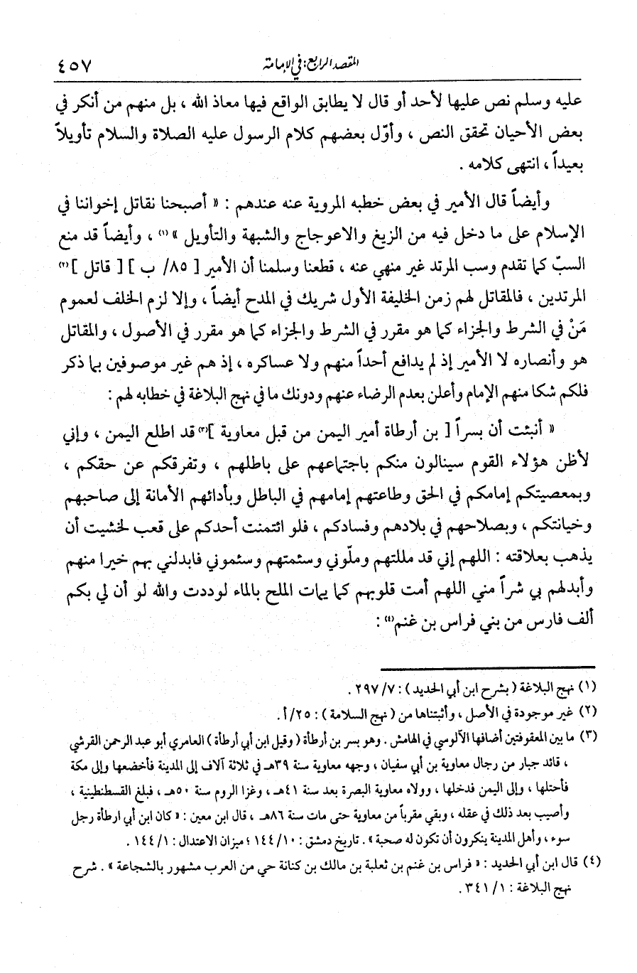 وأيضا قال الأمير في بعض خطبه المروية عنه عندهم: «أصبحنا نقاتل إخواننا في الإسلام على ما دخل فيه من الزيغ والاعوجاج والشبهة والتأويل». وأيضا قد منع السب كما تقدم، وسب المرتد غير منهي عنه. قطعنا وسلمنا أن الأمير قاتل المرتدين، فالمقاتل لهم زمن الخليفة الأول شريك في المدح أيضا، وإلا لزم الخلف لعموم من في الشرط والجزاء كما تقرر في الأصول. والمقاتل هو وأنصاره لا الأمير، إذ لم يدافع أحدا منهم ولا عساكره، إذ هم غير موصوفين بما ذكر، فلكم شكا منهم الإمام وأعلن بعدم الرضاء عنهم. ودونك ما في نهج البلاغة في خطابه لهم: «أنبئتُ أن بُسرا قد اطلع اليمن، وإني لأظن هؤلاء القوم سيدالون منكم باجتماعهم على باطلهم وتفرقكم عن حقكم، وبمعصيتكم إمامكم في الحق وطاعتهم إمامهم في الباطل، وبأدائهم الأمانة إلى أصحابهم وخيانتكم، وبصلاحهم في بلادهم وفسادكم. فلو ائتمنت أحدكم على قعب لخشيت أن يذهب بعلاقته. اللهم إني قد مللنهم وملوني وسئمتهم وسئموني، فأبدلني بهم خيرا منهم وأبدلهم بي شرا مني. اللهم مِثْ قلوبهم كما يماث الملح بالماء. لوددت والله لو أن لي بكم ألف فارس من بني فراس بن غنم: