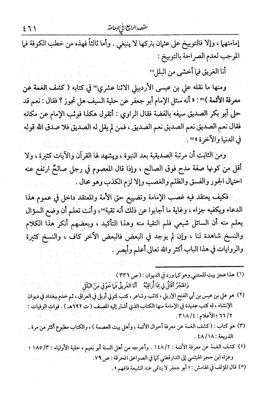 ومنها ما نقله علي بن عيسى الإربلي الاثنا عشري في كتابه كشف الغمة في معرفة الأئمة أنه: «سُئل الإمام أبو جعفر عن حلية السيف هل تجوز؟ فقال: نعم، قد حلى أبو بكر الصديق سيفه بالفضة. فقال الراوي: أتقول هكذا؟ فوثب الإمام عن مكانه فقال: نعم الصديق، نعم الصديق، فمن لم يقل له الصديق فلا صدق الله قوله في الدنيا والآخرة» ومن الثابت أن مرتبة الصديقية بعد النبوة، ويشهد لها القرآن، والآيات كثيرة. ولا أقل من كونها صفة مدح فوق الصالح، وإذا قال المعصوم في رجل صالح ارتفع عنه احتمال الجور والفسق والظلم والغضب، وإلا لزم الكذب وهو محال. فكيف يعتقد فيه غصب الإمامة وتضييع حق الأمة؟ والمعتقد داخل في عموم هذا الدعاء، ويكفيه جزاء.