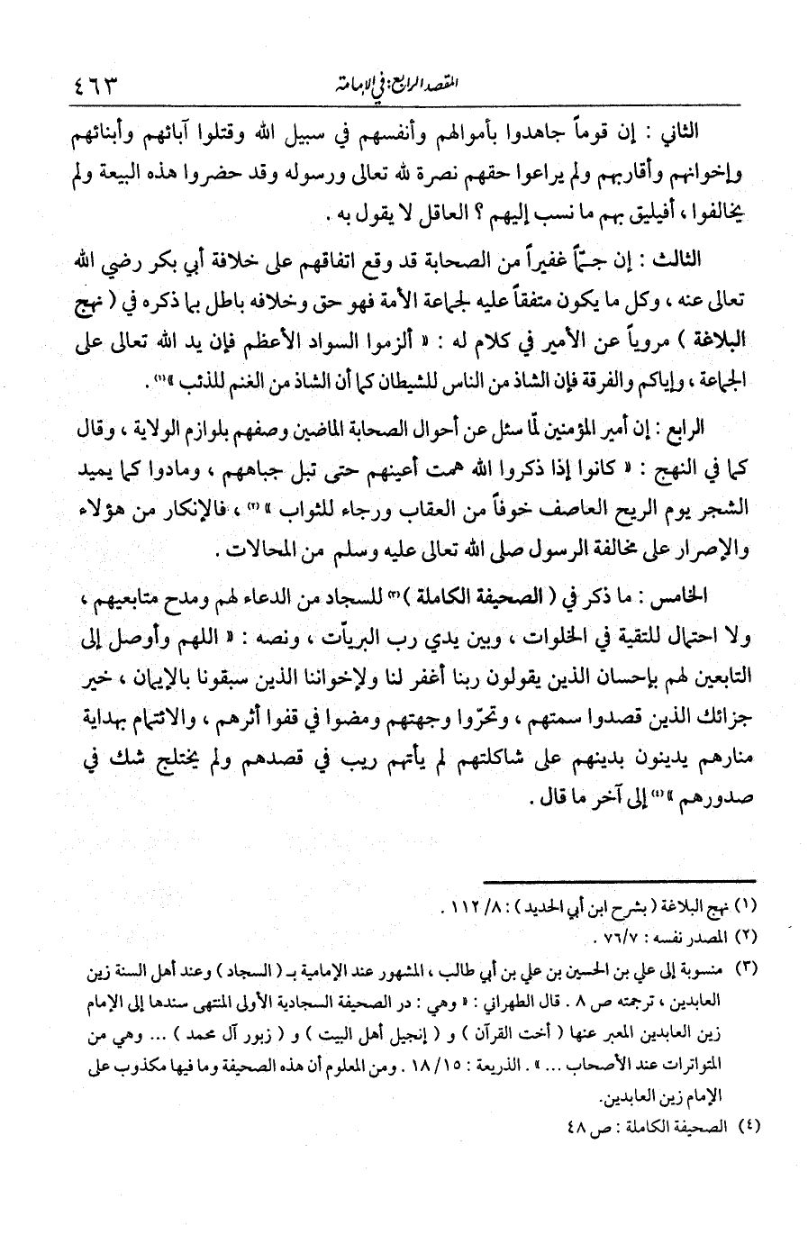 الخامس: ما ذكر في الصحيفة الكاملة للسجاد من الدعاء لهم ومدح متابعيهم، ولا احتمال للتقية في الخلوات وبين يدي رب البريات. ونصه: «اللهم وأوصل إلى التابعين لهم بإحسان الذين يقولون {ربنا اغفر لنا ولإخواننا الذين سبقونا بالإيمان} خير جزائك، الذين قصدوا سمتهم وتحروا وجهتهم ومضوا في قفو أثرهم والائتمام بهداية منارهم يدينون بدينهم على شاكلتهم، لم يأتهم ريب في قصدهم ولم يختلج شك في صدورهم» إلى آخر ما قال.