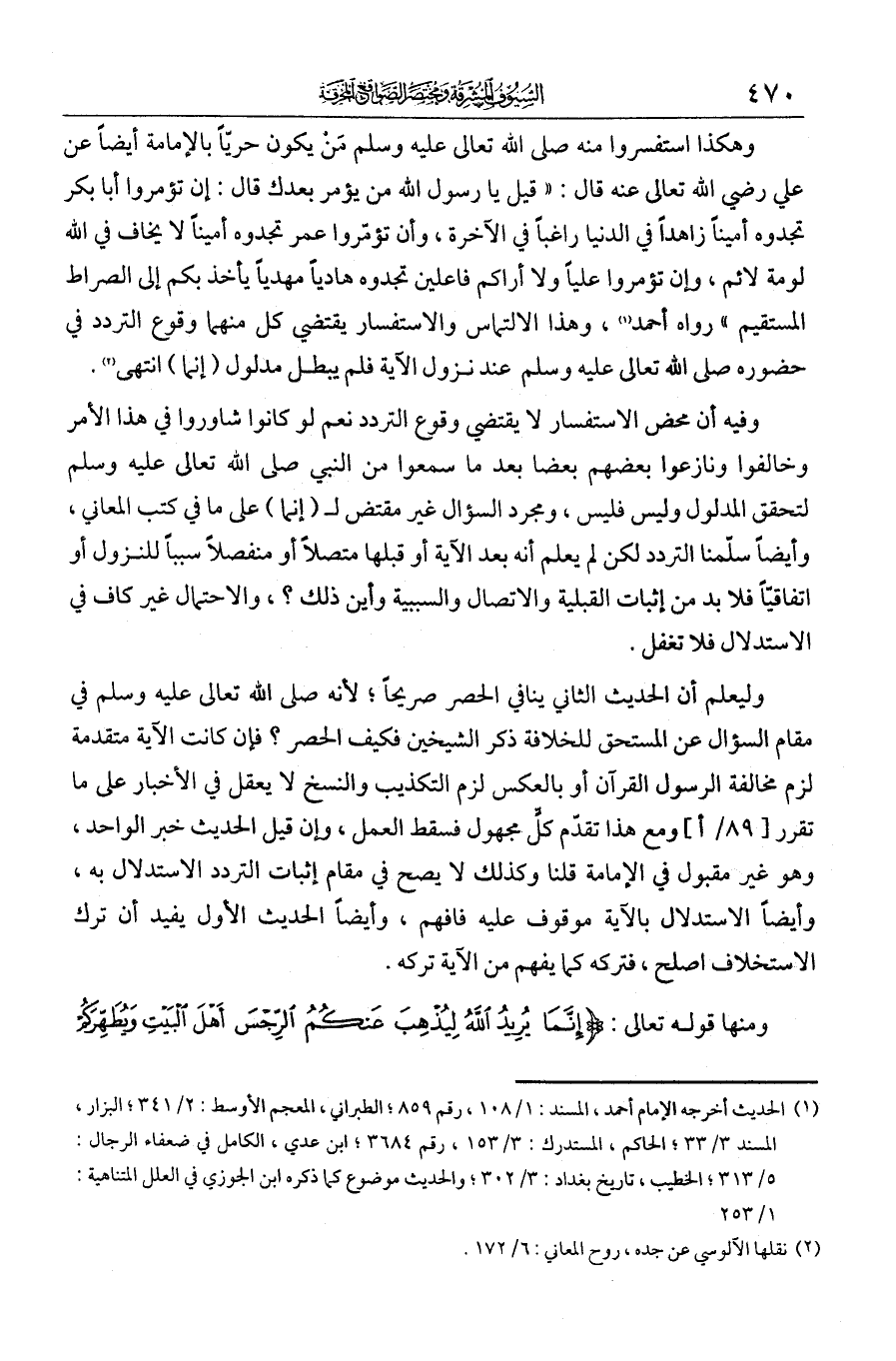 وفيه أن محض الاستفسار لا يقتضي وقوع التردد. نعم لو كانوا شاوروا في هذا الأمر وخالفوا ونازعوا بعضهم بعضا بعد ما سمعوا من النبي - صلى الله عليه وسلم - تحقق المدلول [لإنما]، وليس فليس. ومجرد السؤال غير مقتض لـ"إنما" على ما في كتب المعاني. وأيضا سلمنا التردد لكن لم يعلم أنه بعد الآية أو قبلها متصلا أو منفصلا سببا للنزل أو اتفاقيا، فلا بد من إثبات القبلية والاتصال والسببية وأنى ذلك. والاحتمال غير كاف في الاستدلال فلا تغفل. وليعلم أن الحديث الثاني ينافي الحصر صريحا، لأنه - صلى الله عليه وسلم - في مقام السؤال عن المستحق للخلافة ذكر الشيخين فكيف الحصر؟ فإن كانت الآية متقدمة لزم مخالفة الرسول القرآن أو بالعكس لزم التكذيب. والنسخ لا يعقل في الأخبار على ما تقرر. ومع هذا تقدُّم كلًّ مجهولٌ فسقط العمل. وإن قيل الحديث خبر الواحد وهو غير مقبول في الإمامة، قلنا وكذلك لا يصح في مقام إثبات التردد الاستدلال به، وأيضا الاستدلال بالآية موقوف عليه فافهم. وأيضا الحديث الأول يفيد أن ترك الاستخلاف أصلح فتركَه، كما يفهم من الآية تركُه.