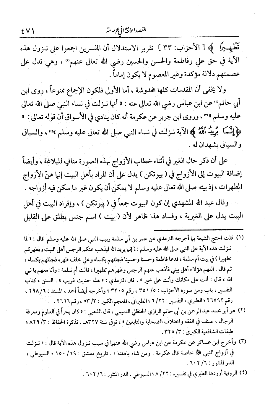 تطهيرا}، تقرير الاستدلال أن المفسرين أجمعوا على نزول هذه الآية في حق علي وفاطمة والحسن والحسين رضي الله تعالى عنهم، وهي تدل عل عصمتهم دلالة مؤكدة، وغير المعصوم لا يكون إماما.