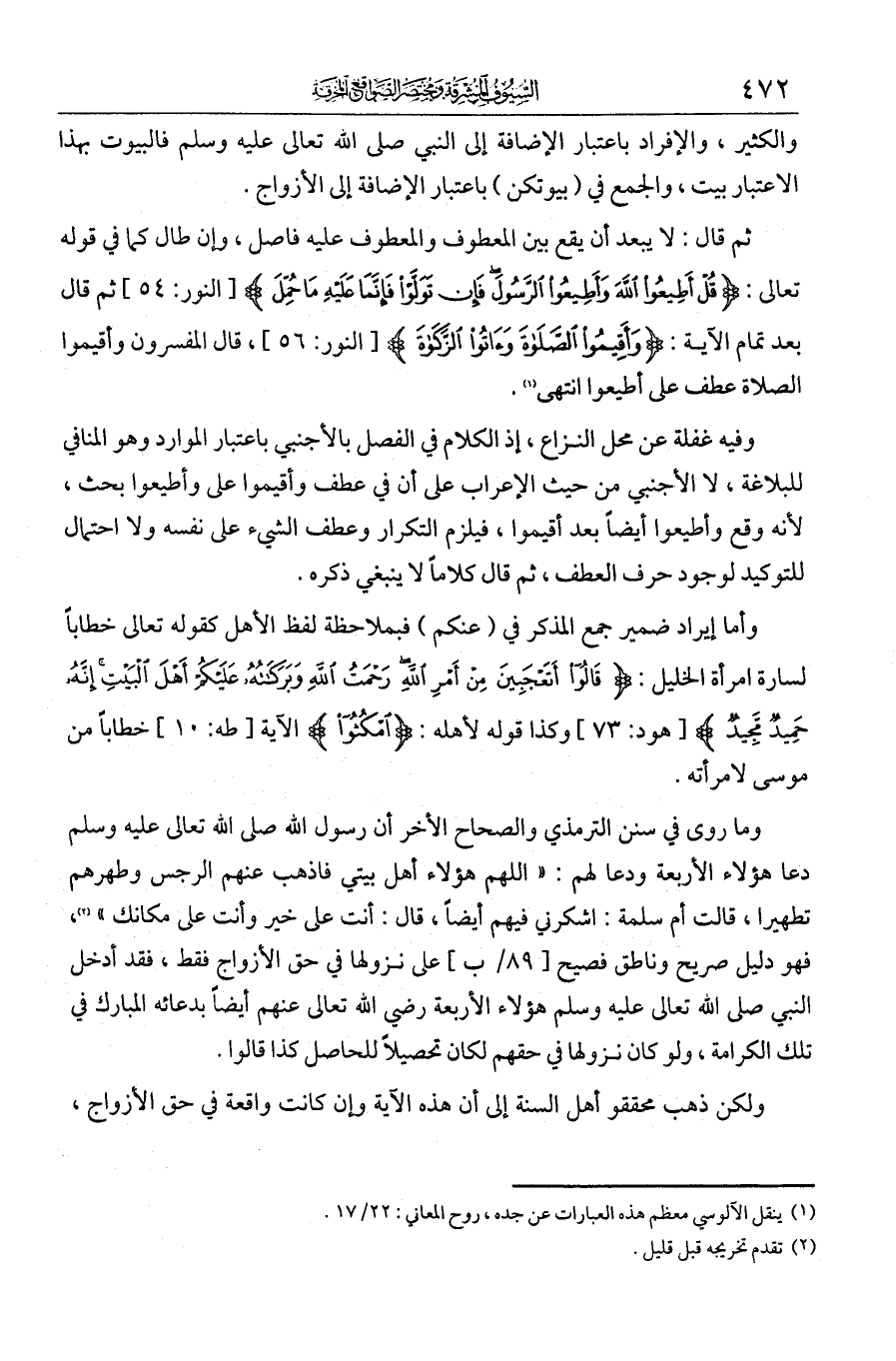 وما روي في سنن الترمذي والصحاح الأخر أن رسول الله - صلى الله عليه وسلم - دعا هؤلاء الأربعة ودعا لهم: «اللهم هؤلاء أهل بيتي فأذهب عنهم الرجس وطهرهم تطهيرا» قالت أم سلمة: أشركني فيهم أيضا، قال: «أنت على خير وأنت على مكانك». فهو دليل صريح على نزولها في حق الأزواج فقط، فقد أدخل النبي - صلى الله عليه وسلم - هؤلاء الأربعة رضي الله تعالى عنهم أيضا بدعائه المبارك في تلك الكرامة، ولو كان نزولها في حقهم لكان تحصيلا للحاصل. كذا قالوا.