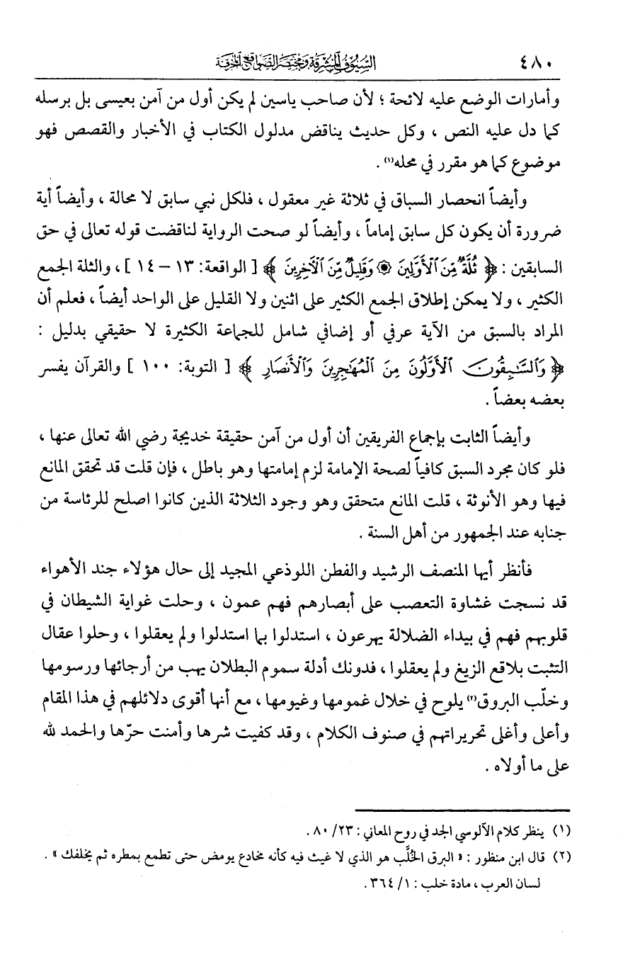 فانظر أيها المنصف الرشيد والفطن اللوذعي المجيد إلى حال هؤلاء جند الأهواء قد نسجت غشاوة التصعب على أبصارهم فهم عمون وحلت غواية الشيطان قلوبهم فهم في بيداء الضلالة يهرعون، استدلوا بما استدلوا ولم يعقلوا، وحلوا عقال التثبت بلاقع الزيغ ولم يعقلوا. فدونك أدلة سموم البطلان يهب من أرجائها ورسومها وخلب البروق يلوح في خلال غمومها وغيومها، مع أنها أقوى دلائلهم في هذا المقام وأعلى وأغلى تحريراتهم في صنوف الكلام. وقد كفيت شرها وأمنت حرها. والحمد لله على ما أولاه.