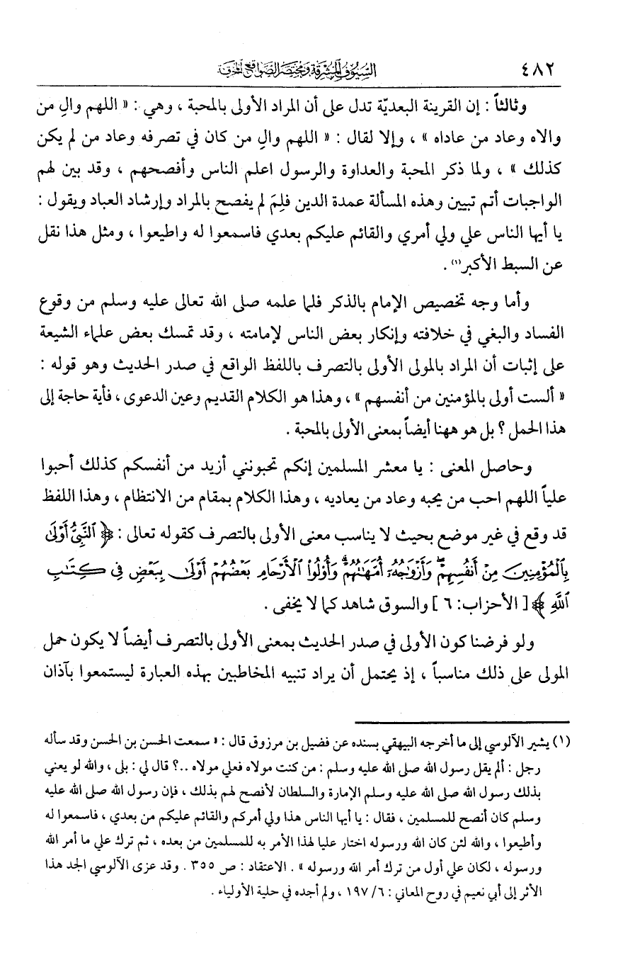 وثالثا إن القرينة البعدية تدل على أن المراد الأولى بالمحبة، وهي قوله: «اللهم وال من والاه وعاد من عاداه»، وإلا لقال: اللهم وال من كان في تصرفه وعاد من لم يكن كذلك، ولما ذكر المحبة والعداوة. والرسول أعلم الناس وأفصحهم، وقد بين لهم الواجبات أتم تبيين، وهذه المسألة عماد الدين، فلمَ لم يفصح بالمراد وإرشاد العباد ويقول: "يا أيها الناس علي ولي أمري والقائم عليكم بعدي"، ومثل هذا نُقل عن السبط الأكبر.