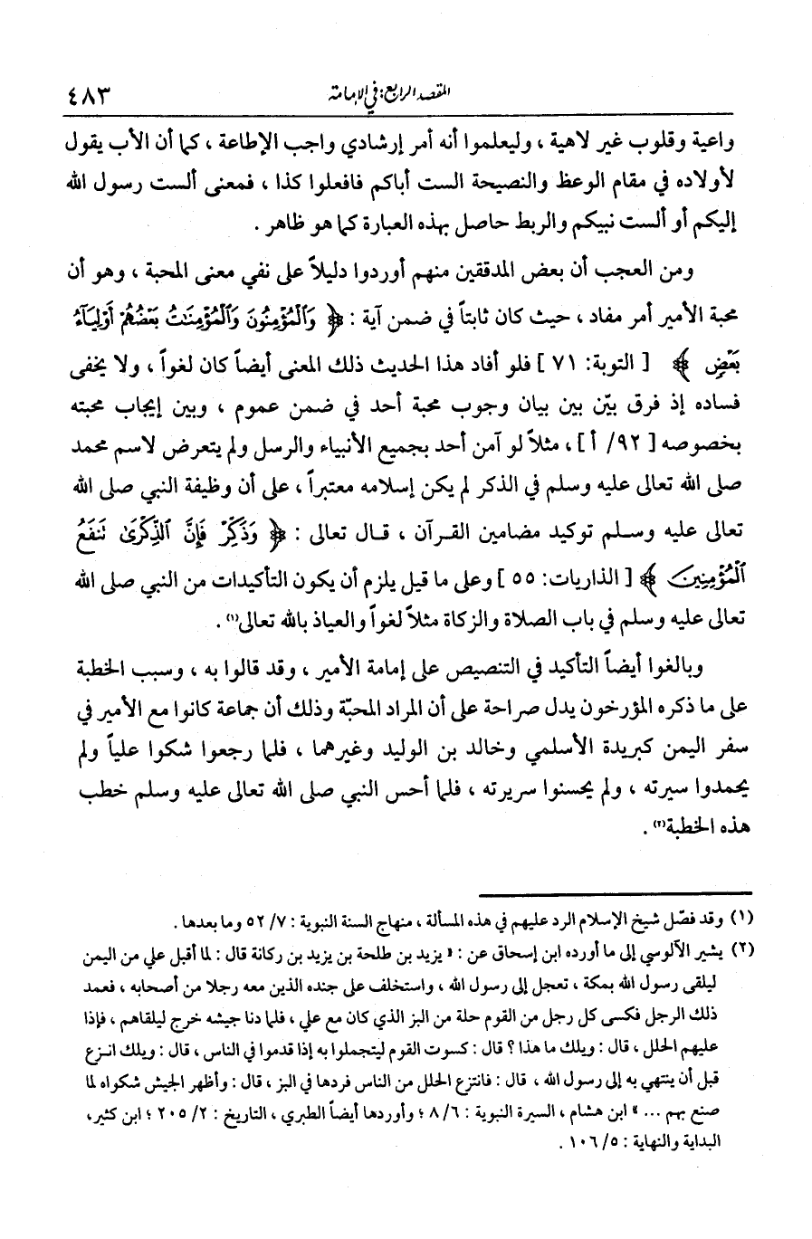 ومن العجب أن بعض المدققين منهم أوردوا دليلا على نفي المحبة، وهو أن محبة الأمير أمر مفاد حيث كان ثابتا في ضمن آية {والمؤمنون والمؤمنات بعضهم أولياء بعض} فلو أفاد هذا الحديث ذلك المعنى أيضا كان لغوا. ولا يخفى فساده، إذ فرق بيّن بين بيان وجوب محبة أحد في ضمن عموم وبين إيجاب محبته بخصوصه. مثلا لو آمن أحد بجميع الأنبياء والرسل ولم يتعرض لاسم محمد - صلى الله عليه وسلم - في الذكر لم يكن إسلامه معتبرا. على أن وظيفة النبي توكيد مضامين القرآن، قال تعالى: {وَذَكِّرْ فَإِنَّ الذِّكْرَى تَنْفَعُ الْمُؤْمِنِينَ}. وعلى ما قيل يلزم أن تكون التأكيدات من النبي في باب الصلاة والزكاة مثلا لغوا والعياذ بالله تعالى. وبالغوا أيضا التأكيد في التنصيص على إمامة الأمير، وقد قالوا به.