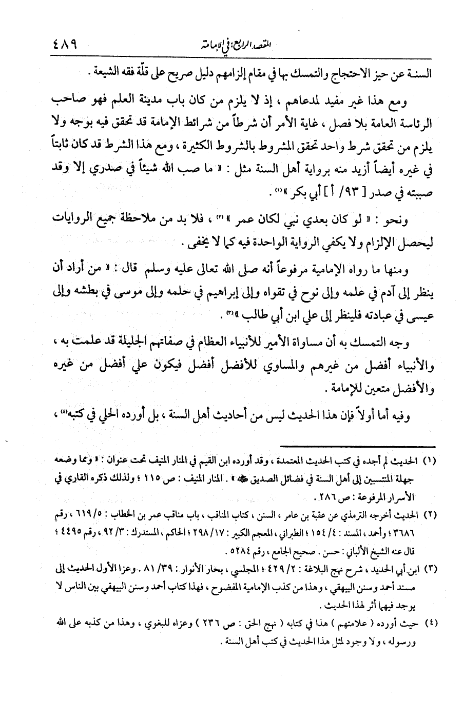 السنة عن حيز الاحتجاج والتمسك بها في مقام إلزامهم دليل صريح على قلة فقه الشيعة. ومع هذا غير مفيد لمدعاهم، إذ لا يلزم أن من كان باب مدينة العلم فهو صاحب الرئاسة العامة بلا فصل، غايته أن شرطا من شروط الإمامة قد تحقق فيه بوجه ولا يلزم من تحقق شرط تحقق المشروط بالشروط الكثيرة، مع أن هذا الشرط كان ثابتا في غيره أيضا أزيد منه برواية أهل السنة مثل: «ما صب الله شيئا في صدري إلا وقد صببته في صدر أبي بكر» ونحو: «لو كان بعدي نبي لكان عمر» فلا بد من ملاحظة جميع الروايات ليحصل الإلزام، ولا يكفي الرواية الواحدة كما لا يخفى.