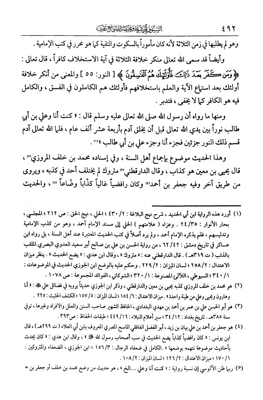 وهذا الحديث موضوع بإجماع أهل السنة، وفي إسناده محمد بن خلف المروزي. قال يحيى بن معين: هو كذاب. وقال الدارقطني: متروك ولم يختلف أحد في كذبه. ويروى من طريق آخر وفيه جعفر بن أحمد، وكان رافضيا غاليا كذابا وضاعا. والحديث