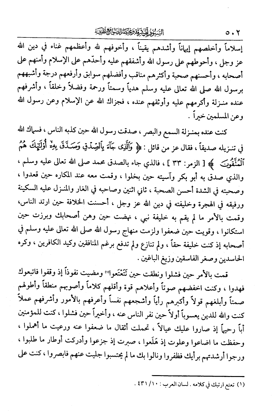 إسلاما وأخلصهم إيمانا، وأشدهم يقينا، وأخوفهم لله، وأعظمهم غناء في دين الله عز وجل، وأحوطهم على رسول الله وأشفقهم عليه، وأحدبهم على الإسلام، وأمنهم على أصحابه، وأحسنهم صحبة، وأكثرهم مناقب، وأفضلهم سوابق، وأرفعهم درجة، وأشبههم برسول الله - صلى الله عليه وسلم - هديا وسمتا ورحمة وفضلا وخلقا، وأشرفهم عنده منزلة وأكرمهم عليه، وأوثقهم عنده. فجزاك الله عن الإسلام وعن رسول الله وعن المسلمين خيرا. كنت عنده بمنزلة السمع والبصر، صدّقت رسول الله حين كذبه الناس فسماك الله في تنزيله صديقا فقال عز وجل {والذي جاء بالصدق وصدق به أولئك هم المتقون} فالذي جاء بالصدق محمد - صلى الله عليه وسلم -، والذي صدق به أبو بكر. وآسيته حين بخلوا، وقمت معه عند المكاره حين عنه قعدوا وصحبته في الشدة أحسن الصحبة، ثاني اثنين وصاحبه في الغار والمنزل عليه السكينة ورفيقه في الهجرة وخليفته في دين الله عز وجل. أحسنت الخلافة حين ارتد الناس وقمت بالأمر ما لم يقم به خليفة نبي. نهضت حين وهن أصحابك وبرزت حين استكانوا وقويت حين ضعفوا ولزمت منهاج رسول الله - صلى الله عليه وسلم - في أصحابه إذ كنت خليفته حقا، ولم تنازع ولم تدفع برغم المنافقين وكيد الكافرين وكره الحاسدين وضغن الفاسقين وزيغ الباغين. قمت بالأمر حين فشلوا ونطقت حين تعتعوا ومضيت نفوذا إذ وقفوا فاتبعوك فهدوا، وكنت أخفضهم صوتا وأعلاهم قوة وأقلهم كلاما وأصوبهم منطقا وأطولهم صمتا وأبلغهم قولا وأكبرهم رأيا وأشجعهم نفسا وأعرفهم بالأمور وأشرفهم عملا. كنت والله للدين يعسوبا حين نفر الناس عنه وآخرا حين فشلوا.