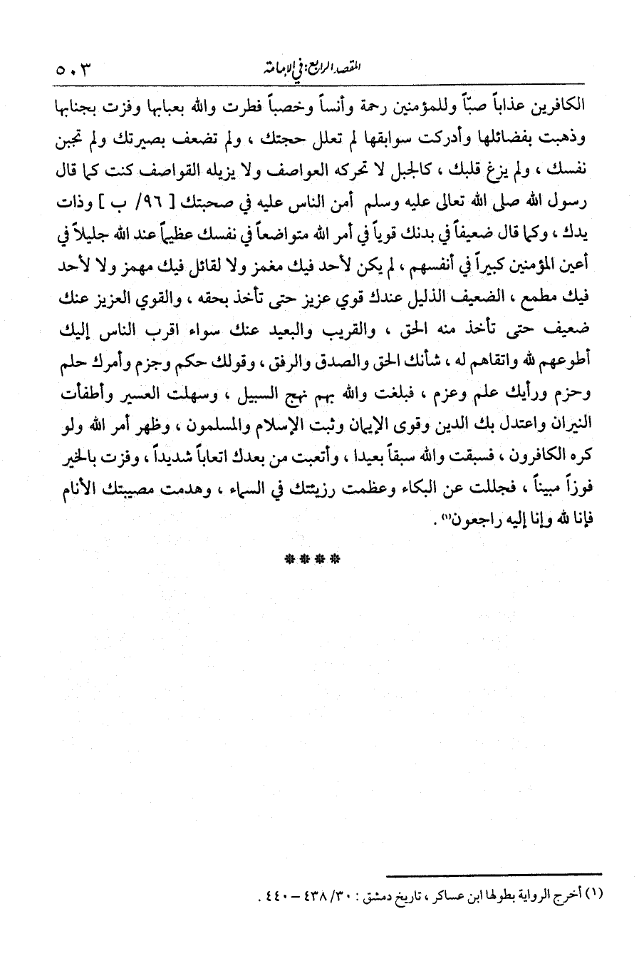 الكافرين عذابا صبا وللمؤمنين رحمة وأنسا وحصنا، فطرت والله بعبابها وفزت بجنابها وذهت بفضائلها وأدركت سوابقها، لم تقلل حجتك ولم تضعف بصيرتك ولم تجبن نفسك ولم يزغ قلبك، كنت كالجبل لا تحركه العواصف ولا تزيله القواصف. كنت كما قال رسول الله - صلى الله عليه وسلم - أمن الناس عليه في صحبتك وذات بلدك، وكما قال ضعيفا في بدنك قويا في أمر الله متواضعا في نفسك عظيما عند الله جليلا في أعين المؤمنين كبيرا في أنفسهم، لم يكن لأحد فيك مغمز ولا لقائل فيك مهمز ولا لأحد فيك مطمع. الضعيف الذليل عندك قوي عزيز حتى تأخذ بحقه، والقوي العزيز عندك ضعيف حتى تأخذ منه الحق. والقريب والبعيد عندك سواء. أقرب الناس إليك أطوعهم لله وأتقاهم له. شأنك الحق والصدق والرفق وقولك حكم وجزم وأمرك حلم وحزم ورأيك علم وعزم، فبلغت والله بهم نهج السبيل وسهلت العسير وأطفأت النيران واعتدل بك الدين وقوي الإيمان وثبت الإسلام والمسلمون وظهر أمر الله ولو كره الكافرون، فسبقت والله سبقا بعيدا وأتعبت من بعدك إتعابا شديدا وفزت بالخير فوزا مبينا، فجللت عن البكاء وعظمت رزيتك وهدت مصيبتك الأنام. فإنا لله وإنا إليه راجعون».