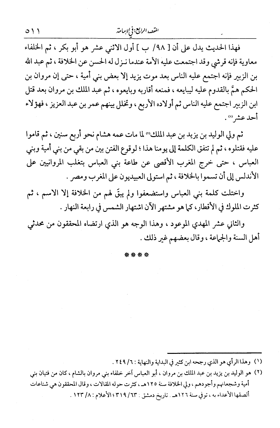 فهذا الحديث يدل على أن أول الاثني عشر هو أبو بكر. ثم معاوية فإنه قرشي وقد اجتمعت عليه الأمة عندما نزل له الحسن عن الخلافة. ثم عبد الله بن الزبير فإنه اجتمع عليه الناس بعد موت يزيد إلا بعض بني أمية، حتى إن مروان بن الحكم همّ بالقدوم عليه ليبايعه فمنعه أقاربه وبايعوه. ثم عبد الملك بن مروان بعد قتل ابن الزبير اجتمع عليه الناس. ثم أولاده الأربعة، وتخلل بينهم عمر بن عبد العزيز، فهؤلاء أحد عشر. ثم ولي الوليد بن يزيد بن عبد الملك لما مات عمه هشام نحو أربع سنين، ثم قاموا عليه فقتلوه. ثم لم تتفق الكلمة إلى يومنا هذا لوقوع الفتن بين من بقي من بني أمية وبني العباس، حتى خرج المغرب الأقصى عن طاعة بني العباس بتغلب المروانيين على الأندلس إلى أن تسمّوا بالخلافة. ثم استولى العبيديون على المغرب ومصر. واختلت كلمة بني العباس واستضعفوا، ولم يبق من الخلافة إلا الاسم. ثم كثرت الملوك في الأقطار كما هو مشتهر الآن اشتهار الشمس في رابعة النهار. والثاني عشر المهدي الموعود. وهذا الوجه هو الذي ارتضاه المحققون من محدثي أهل السنة والجماعة. وقال بعضهم غير ذلك.