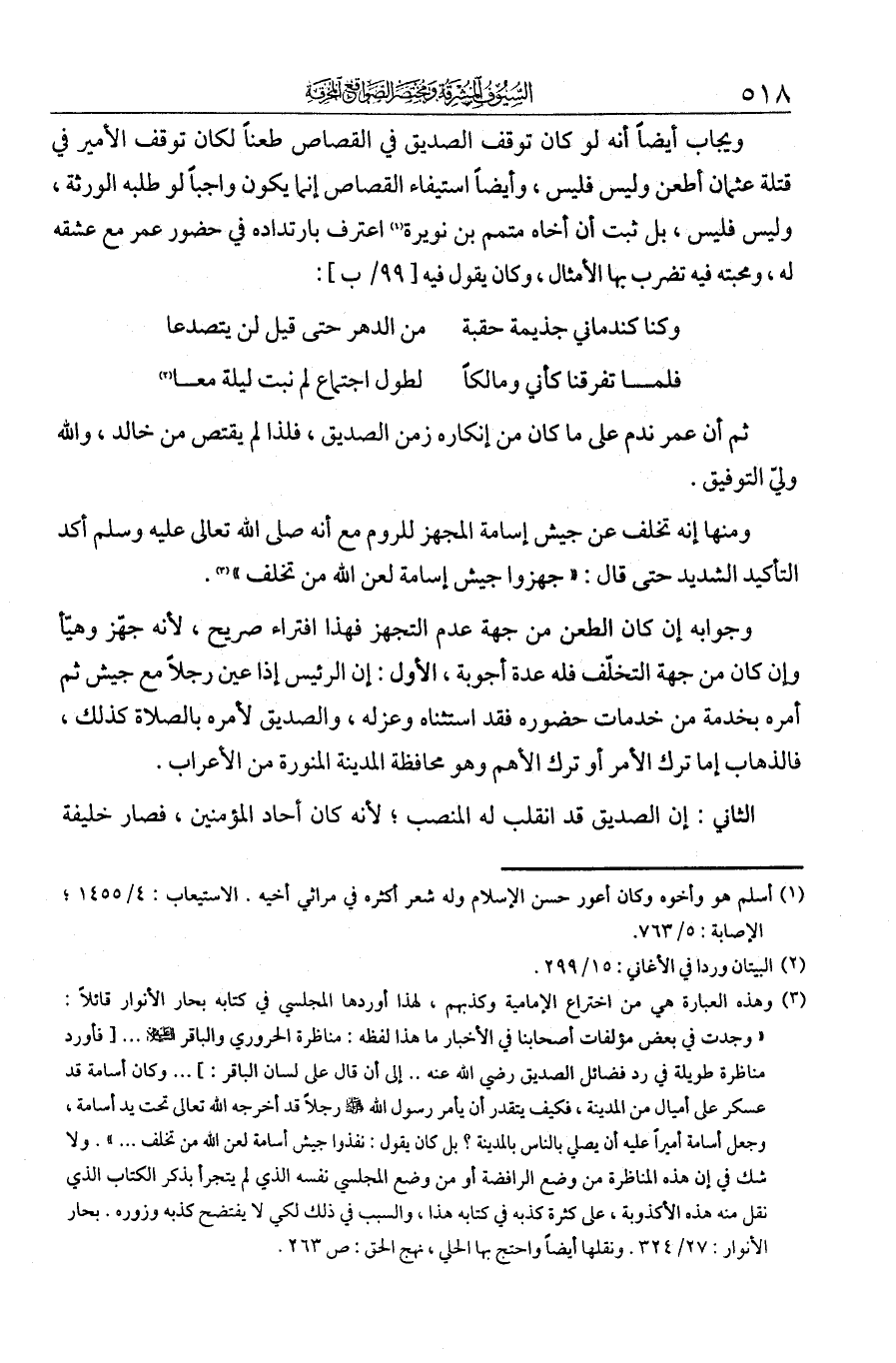 وجوابه إن كان الطعن من جهة عدم التجهز فهذا افتراء صريح، لأنه جهز وهيأ؛ وإن كان من جهة التخلف فله عدة أجوبة. الأول أن الرئيس إذا عين رجلا مع جيش ثم أمره بخدمة من خدمات حضوره فقد استثناه وعزله، والصديق لأمره بالصلاة كذلك، فالذهاب إما ترك الأمر أو ترك الأهم وهو محافظة المدينة المنورة من الأعراب. الثاني أن الصديق قد انقلب له المنصب، لأنه كان آحاد المؤمنين فصار خليفة