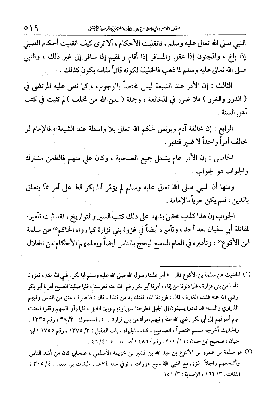 النبي - صلى الله عليه وسلم - فانقلبت الأحكام. ألا ترى كيف انقلبت أحكام الصبي إذا بلغ والمجنون إذا عقل والمسافر إذا أقام والمقيم إذا سافر إلى غير ذلك. والنبي - صلى الله عليه وسلم - لما ذهب فالخليفة لكونه قائما مقامه يكون كذلك. الثالث أن الأمر عند الشيعة ليس مختصا بالوجوب، كما نص عليه المرتضى في الدرر والغرر، فلا ضرر في المخالفة. وجملة "لعن الله من تخلف" لم تثبت في كتب أهل السنة. الرابع أن مخالفة آدم ويونس لحكم الله تعالى بلا واسطة عند الشيعة، فالإمام لو خالف أمرا واحدا فلا ضير، فتدبر. الخامس أن الأمر عام يشمل جميع الصحابة، وكان علي منهم، والجواب هو الجواب.