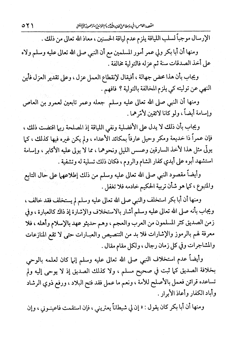 ويجاب بأنه - صلى الله عليه وسلم - أشار بالاستخلاف، والإشارة إذ ذاك كالعبارة. وفي زمن الصديق كثر المسلمون من العرب والعجم وهم حديثو عهد بالإسلام وأهله، فلا معرفة لهم بالرموز والإشارات، فلا بد من التنصيص والعبارات حتى لا تقع المنازعات والمشاجرات. وفي كل زمان رجال، ولكل مقام مقال. وأيضا عدم استخلاف النبي - صلى الله عليه وسلم - إنما كان لعلمه بالوحي بخلافة الصديق كما ثبت في صحيح مسلم، ولا كذلك الصديق إذ لا يوحى إليه ولم تساعده قرائن فعمل بالأصلح للأمة. ونعم ما عمل فقد فتح البلاد ورفع ذوي الرشاد وأباد الكفار وأعاذ الأبرار.
