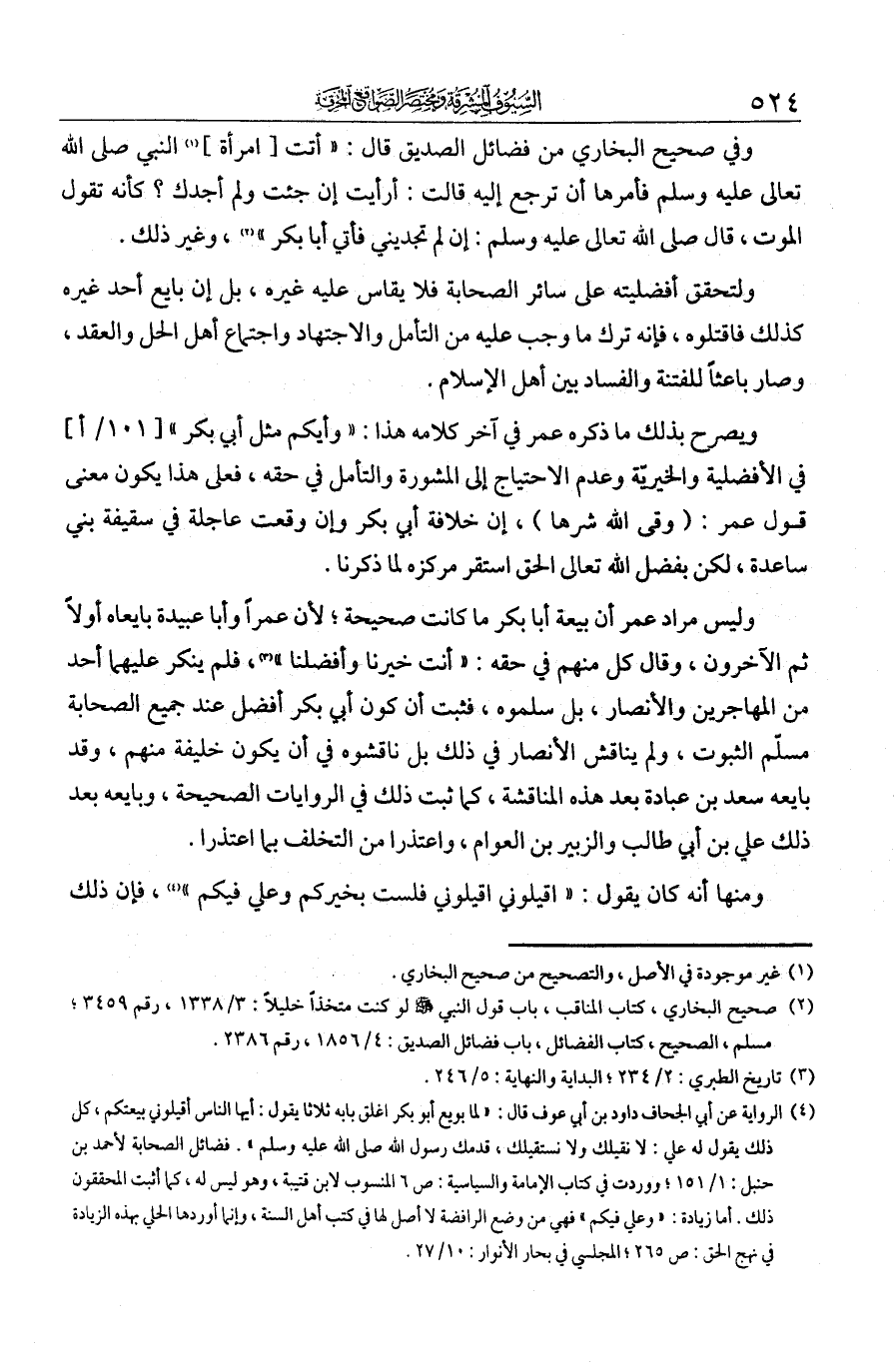 وفي صحيح البخاري من فضائل الصديق قال: أتت [امرأة] النبي - صلى الله عليه وسلم - فأمرها أن ترجع إليه قالت: أرأيت إن جئت ولم أجدك؟ كأنها تقول الموت، قال - صلى الله عليه وسلم -: "إن لم تجديني فأتي أبا بكر". وغير ذلك. ولتحقق أفضليته على سائر الصحابة فلا يقاس عليه غيره. بل إن بايع أحد غيره كذلك فاقتلوه، فإنه ترك ما وجب عليه من التأمل والاجتهاد واجتماع أهل الحل والعقد وصار باعثا للفتنة والفساد بين أهل الإسلام. ويصرح بذلك ما ذكره عمر في آخر كلامه هذا: "وأيكم مثل أبي بكر" في الأفضلية والخيرية وعدم الاحتياج إلى المشورة والتأمل في حقه؟ فعلى هذا يكون معنى قول عمر: "وقى الله شرها" أن خلافة أبي بكر وإن وقعت عاجلة في سقيفة بني ساعدة لكن بفضل الله تعالى الحق استقر مركزه لما ذكرنا. وليس مراد عمر أن بيعة أبي بكر ما كانت صحيحة، لأن عمر وأبا عبيدة بايعاه أولا ثم الآخرون، وقال كل منهما في حقه: "أنت خيرنا وأفضلنا"، فلم ينكر عليهما أحد من المهاجرين والأنصار بل سلموه، فثبت أن كون أبي بكر أفضل عند جميع الصحابة مسلّم الثبوت، ولم يناقش الأنصار في ذلك بل ناقشوه في أن يكون خليفة منهم.