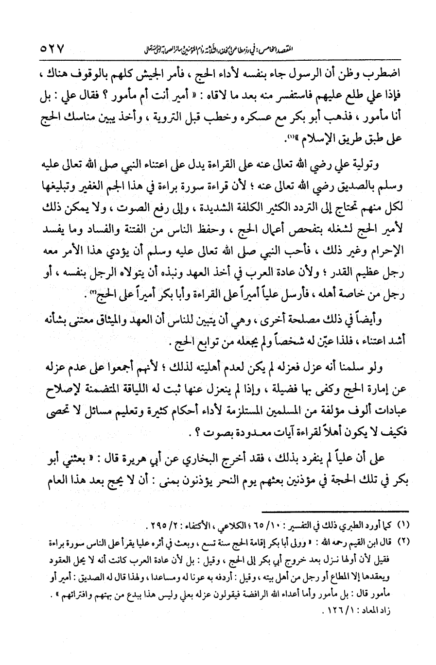 اضطرب وظن أن الرسول جاء بنفسه لأداء الحج فأمر الجيش كلهم بالوقوف، فإذا علي طلع عليهم فاستفسر منه بعد ما لاقاه: "أمير أنت أم مأمور؟ " فقال علي: "بل أنا مأمور"، فذهب أبو بكر مع عسكره وخطب قبل التروية وأخذ يبين مناسك الحج على طبق طريق الإسلام. وتولية علي رضي الله تعالى عنه على القراءة يدل على اعتناء النبي - صلى الله عليه وسلم - بالصديق رضي الله تعالى عنه لأن قراءة سورة براءة في هذا الجم الغفير وتبليغها لكل منهم تحتاج إلى التردد الكثير والكلفة الشديدة وإلى رفع الصوت، ولا يمكن لأمير الحج لشغله بتفحص أعمال الحج وحفظ الناس من الفتنة والفساد وما يفسد الإحرام وغير ذلك، فأحب النبي - صلى الله عليه وسلم - أن يؤدي هذا الأمر معه رجل عظيم القدر. ولأن عادة العرب في أخذ العهد ونبذه أن يتولاه الرجل بنفسه أو رجل من خاصة أهله، فأرسل عليا أميرا على القراءة وأبا بكر أميرا على الحج. وأيضا في ذلك مصلحة أخرى، وهي أن يتبين للناس أن العهد والميثاق معتنى بشأنه أشد اعتناء، لذا عيّن له شخصا ولم يجعله من توابع الحج. ولو سلمنا أنه عزل فعزله لم يكن لعدم أهليته لذلك لأنهم أجمعوا على عدم عزله عن إمارة الحج وكفى بها فضيلة، وإذا لم ينعزل عنها ثبت له اللياقة المتضمنة لإصلاح عبادات ألوف مؤلفة من المسلمين المستلزمة لأداء أحكام كثيرة وتعليم مسائل لا تحصى، فكيف لا يكون أهلا لقراءة آيات معدودة بصوت؟ على أن عليا لم ينفرد بذلك.