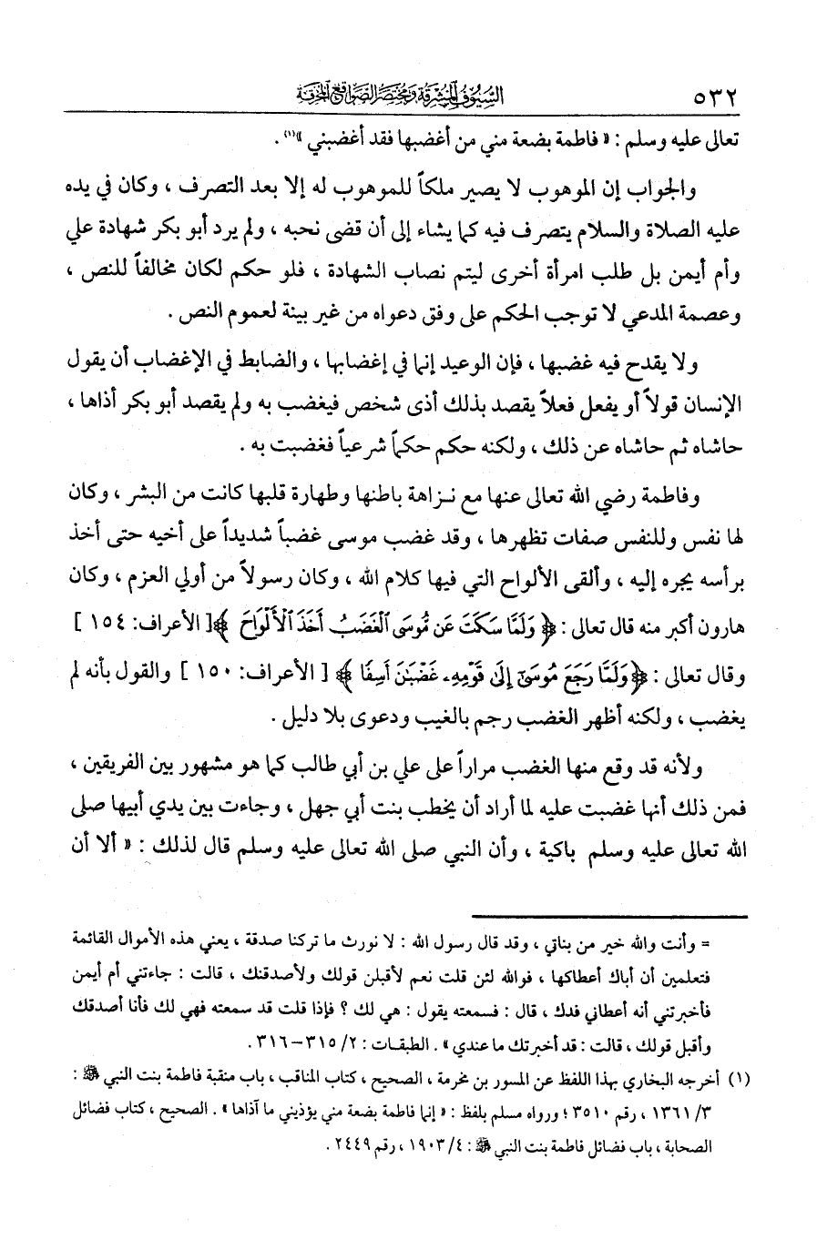 والجواب أن الموهوب لا يصير ملكا للموهوب له إلا بعد التصرف، وكان في يده عليه الصلاة والسلام يتصرف فيه كما يشاء إلى أن قضى نحبه. ولم يرد أبو بكر شهادة علي وأم أيمن بل طلب امرأة أخرى ليتم نصاب الشهادة، فلو حكم لكان مخالفا للنص. وعصمة المدعي لا توجب الحكم على وفق دعواه من غير بينة لعموم النص. ولا يقدح فيه غضبها، فإن الوعيد في إغضابها، والضابط في الإغضاب أن يقول الإنسان قولا أو فعلا يقصد بذلك أذى شخص فيغضب به. ولم يقصد أبو بكر أذاها، حاشاه ثم حاشاه عن ذلك، ولكنه حكم حكما شرعيا فغضبت منه. وفاطمة رضي الله تعالى عنها مع نزاهة باطنها وطهارة قلبها كانت من البشر وكان لها نفس، وللنفس صفات تظهرها. وقد غضب موسى غضبا شديدا على أخيه حتى أخذ برأسه يجره إليه وألقى الألواح التي فيها كلام الله، وكان رسولا من أولي العزم وكان هارون أكبر منه. قال تعالى: {وَلَمَّا سَكَتَ عَنْ مُوسَى الْغَضَبُ أَخَذَ الْأَلْوَاحَ} وقال تعالى: {وَلَمَّا رَجَعَ مُوسَى إِلَى قَوْمِهِ غَضْبَانَ أَسِفًا}. والقول بأنه لم يغضب ولكنه أظهر الغضب رجم بالغيب ودعوى بلا دليل.
