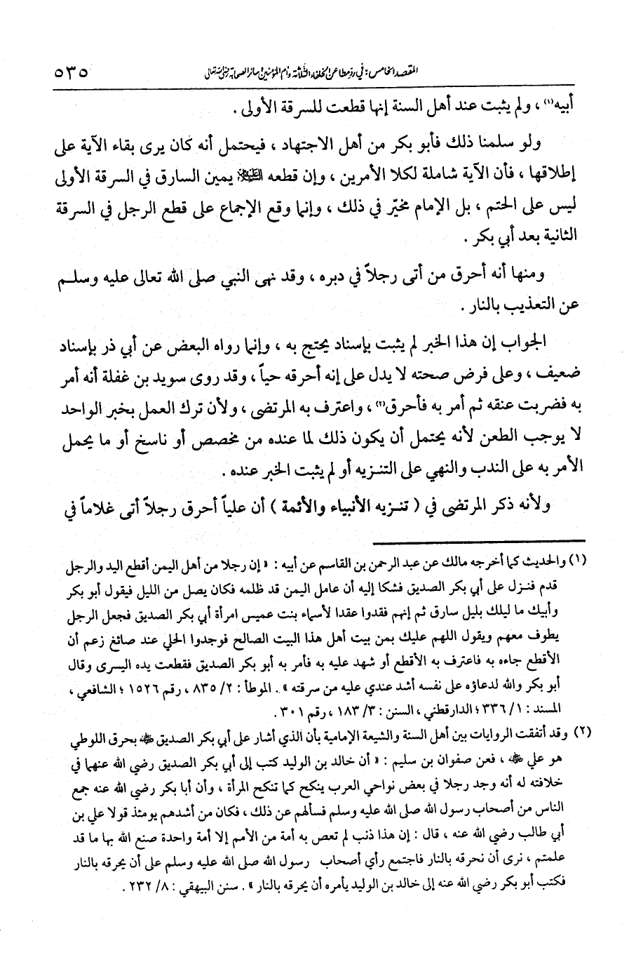 أبيه. ولم يثبت عند أهل السنة أنها قطعت للسرقة الأولى. ولو سلمنا ذلك فأبو بكر من أهل الاجتهاد، فيحتمل أنه كان يرى بقاء الآية على إطلاقها، فإن الآية شاملة لكلا الأمرين، وأن قطعه عليه السلام يمين السارق في السرقة الأولى ليس على الحتم بل الإمام مخير في ذلك. وإنما وقع الإجماع على قطع الرجل في السرقة الثانية بعد أبي بكر.