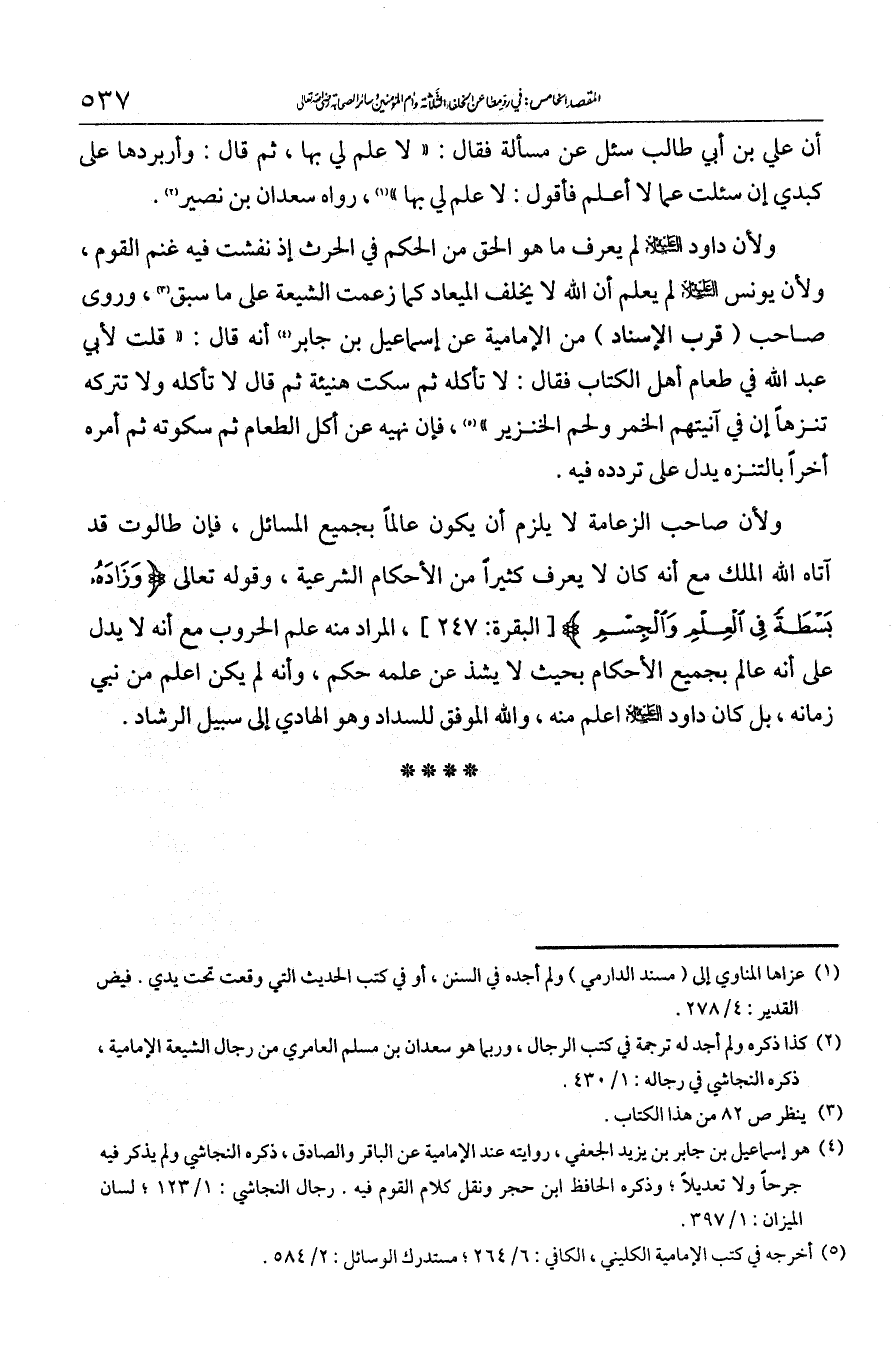 أن علي بن أبي طالب سئل عن مسألة فقال: "لا علم لي بها" ثم قال: "وأبردها على كبدي إن سئلت عما لا أعلم فأقول: لا علم لي بها" رواه سعدان بن نصير. ولأن داود عليه السلام لم يعرف ما هو الحق من الحكم {فِي الْحَرْثِ إِذْ نَفَشَتْ فِيهِ غَنَمُ الْقَوْمِ}، ولأن يونس عليه السلام لم يعلم أن الله لا يخلف الميعاد كما زعمت الشيعة على ما سبق. وروى صاحب قرب الإسناد من الإمامية عن إسماعيل بن جابر أنه قال: قلت لأبي عبد الله في طعام أهل الكتاب فقال: لا تأكله، ثم سكت هنيئة ثم قال: لا تأكله ولا تتركه تنزها، إن في آنيتهم الخمر ولحم الخنزير"، فإن نهيه عن أكل الطعام ثم سكوته ثم أمره آخرا بالتنزه يدل على تردده فيه. ولأن صاحب الزعامة لا يلزم أن يكون عالما بجميع المسائل، فإن طالوت قد آتاه الله الملك مع أنه كان لا يعرف كثيرا من الأحكام الشرعية، وقوله تعالى: {وَزَادَهُ بَسْطَةً فِي الْعِلْمِ وَالْجِسْمِ} المراد منه علم الحروب، مع أنه لا يدل على أنه عالم بجميع الأحكام بحيث لا يشذ عن علمه حكم، وإنه لم يكن أعلم من نبي زمانه، بل كان داود عليه السلام أعلم منه. والله الموفق للسداد وهو الهادي إلى سبيل الرشاد.