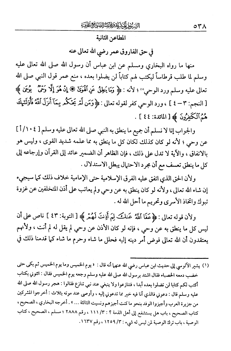 المطاعن الثانية في حق الفاروق عمر رضي الله تعالى عنهمنها ما رواه البخاري ومسلم عن ابن عباس أن رسول الله - صلى الله عليه وسلم - لما طلب قرطاسا ليكتب لهم كتابا لن يضلوا بعده منع عمر قول النبي - صلى الله عليه وسلم - ورد الوحي لأنه {وَمَا يَنْطِقُ عَنِ الْهَوَى * إِنْ هُوَ إِلَّا وَحْيٌ يُوحَى}، ورد الوحي كفر لقوله تعالى: {وَمَنْ لَمْ يَحْكُمْ بِمَا أَنْزَلَ اللَّهُ فَأُولَئِكَ هُمُ الْكَافِرُونَ}.