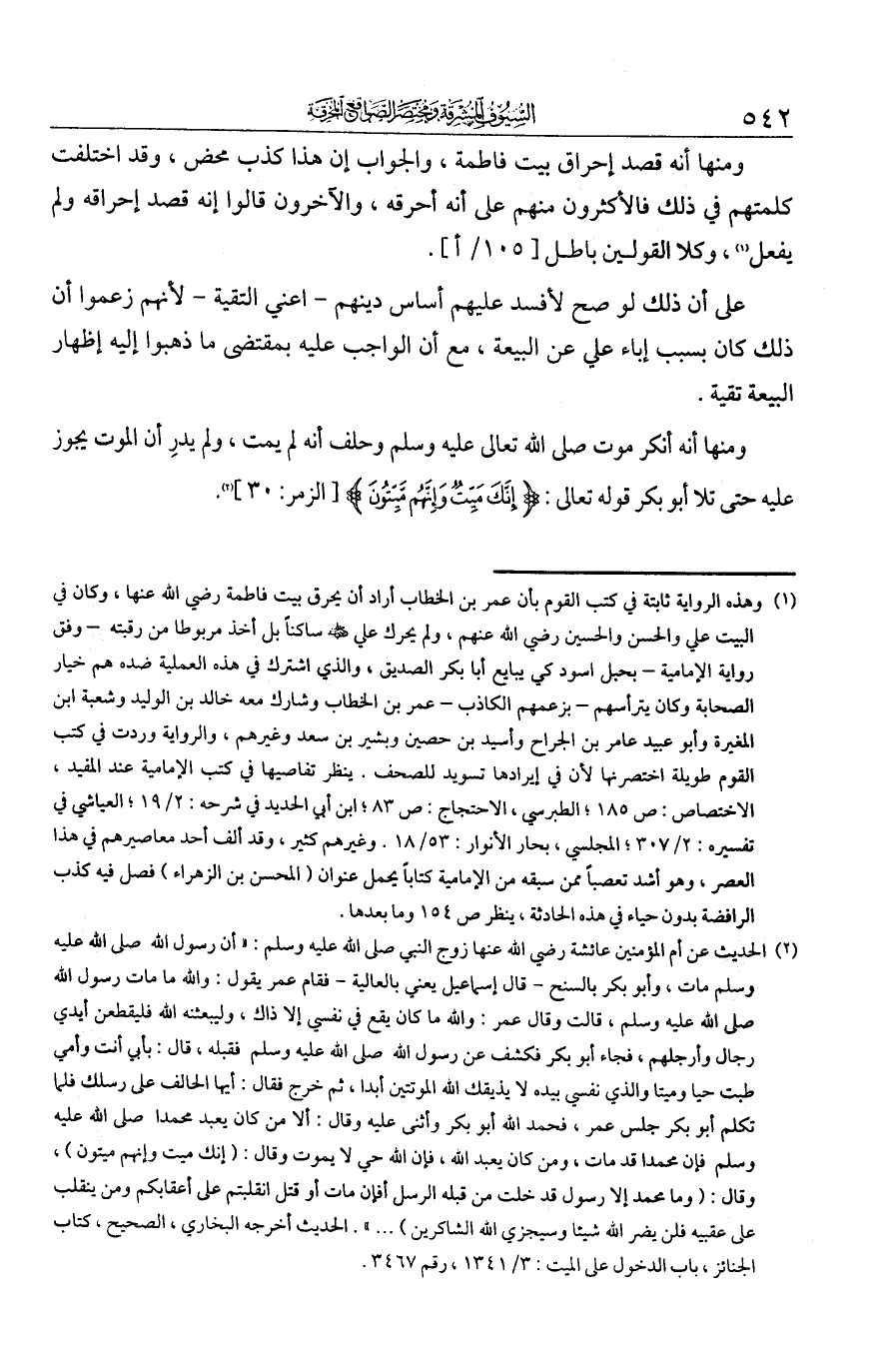 والجواب أن هذا كذب محض. وقد اختلفت كلمتهم في ذلك فالأكثرون منهم على أنه أحرقه، والآخرون قالوا إنه قصد إحراقه ولم يفعل. وكلا القولين باطل. على أن ذلك لو صح لأفسد عليهم أساس دينهم -أعني التقية- لأنهم زعموا أن ذلك كان بسبب إباء علي عن البيعة، مع أن الواجب عليه بمقتضى ما ذهبوا إليه إظهار البيعة تقية.