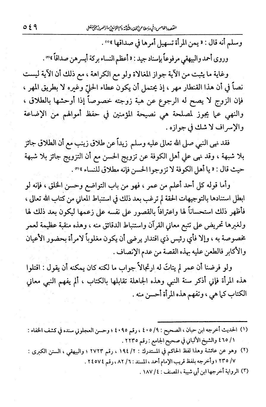 أنه قال: "يمن المرأة تسهيل أمرها في صداقها". وروى أحمد والبيهقي مرفوعا بإسناد جيد: "أعظم النساء بركة أيسرهن صداقا". وغاية ما يثبت من الآية جواز المغالاة ولو مع الكراهة، مع ذلك إن الآية ليست نصا في أن هذا القنطار مهر، إذ يحتمل أن يكون عطاء الحلي وغيره لا بطريق المهر، فإن الزوج لا يصح له الرجوع عن هبة زوجته خصوصا إذا أوحشها بالطلاق، والنهي عما يجوز لمصلحة هي نصيحة للمؤمنين في حفظ أموالهم من الإضاعة والإسراف لا شك في جوازه. فقد نهى النبي - صلى الله عليه وسلم - زيدا عن طلاق زينب مع أن الطلاق جائز بلا شبهة. وقد نهى علي أهل الكوفة عن تزويج الحسن مع أن التزويج جائز بلا شبهة حيث قال: "يا أهل الكوفة لا تجوزوا الحسن فإنه مطلاق للنساء".