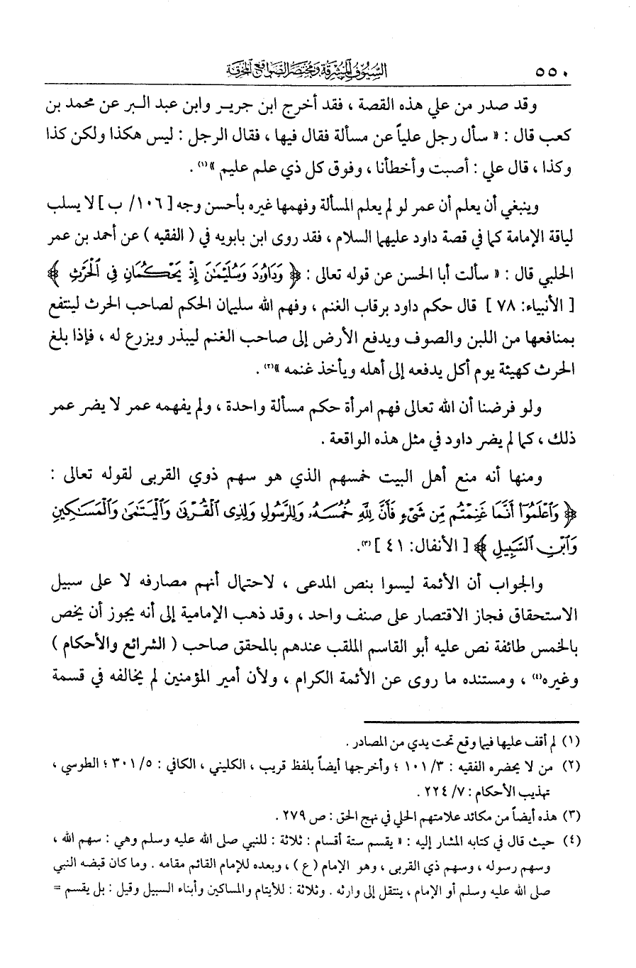 وينبغي أن يعلم أن عمر لو لم يعلم المسألة وفهمها غيره بأحسن وجه لا يسلب لياقة الإمامة كما في قصة داود وسليمان عليهما السلام. فقد روى ابن بابويه في الفقيه عن أحمد بن عمر الحلبي قال: سألت أبا الحسن عن قوله تعالى: {وَدَاوُودَ وَسُلَيْمَانَ إِذْ يَحْكُمَانِ فِي الْحَرْثِ} قال: حكم داود برقاب الغنم، وفهّم الله سليمان الحكم لصاحب الحرث لينتفع بمنافعها من اللبن والصوف ويدفع الأرض إلى صاحب الغنم ليبذر ويزرع له، فإذا بلغ الحرث كهيئة يوم أكل يدفعه إلى أهله ويأخذ غنمه". ولو فرضنا أن الله تعالى فهم امرأة حكم مسألة واحدة ولم يفهمه عمر لا يضر عمر ذلك كما لم يضر داود في مثل هذه الواقعة.