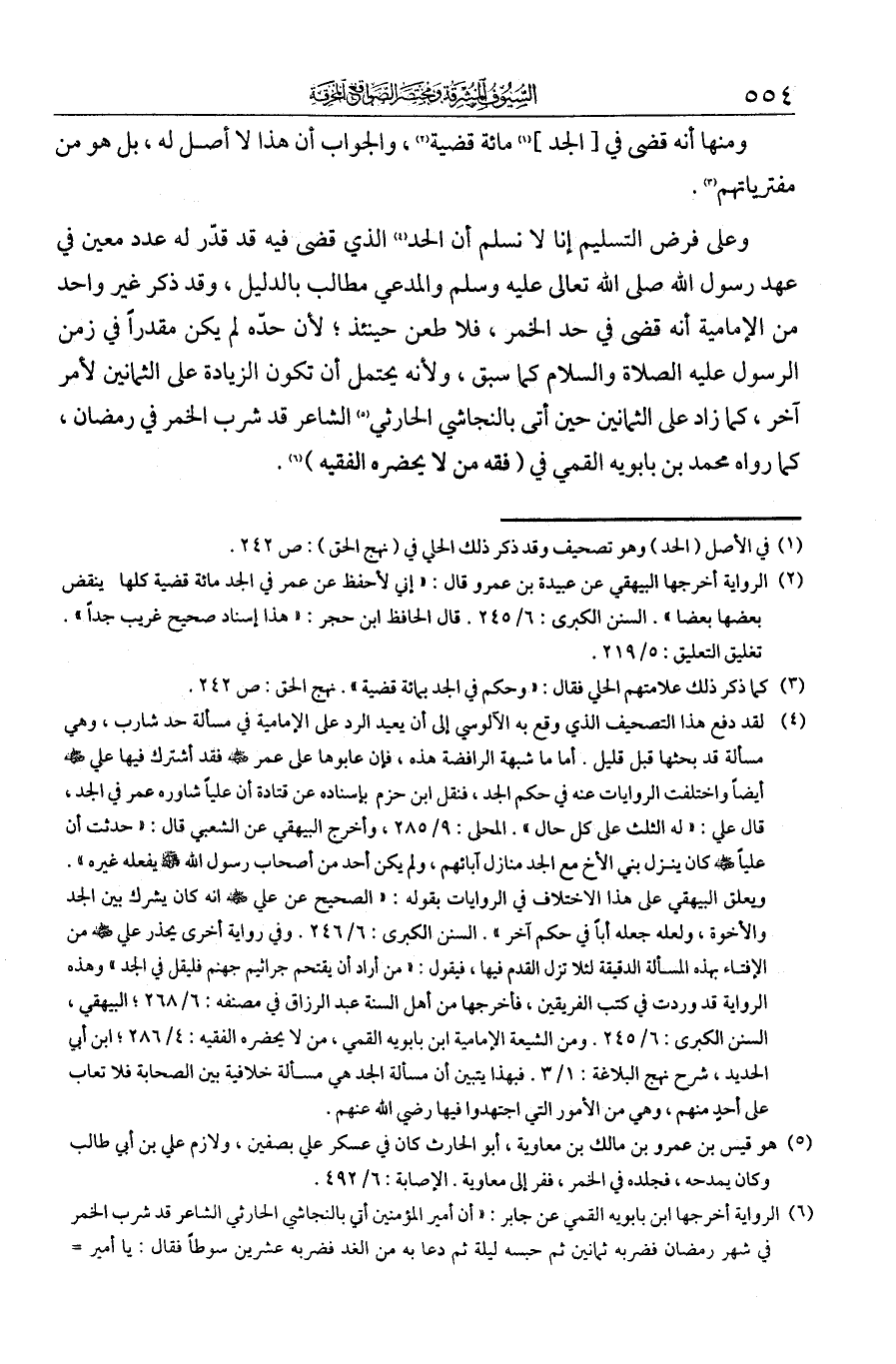والجواب أن هذا لا أصل له، بل هو من مفترياتهم. وعلى فرض التسليم إنا لا نسلم أن الحد الذي قضى فيه قد قدّر له عدد معين في عهد رسول الله - صلى الله عليه وسلم -. والمدعي مطالب بالدليل. وقد ذكر غير واحد من الإمامية أنه قضى في حد الخمر، فلا طعن حينئذ، لأن حده لم يكن مقدرا في زمن الرسول عليه الصلاة والسلام كما سبق، ولأنه يحتمل أن تكون الزيادة على الثمانين لأمر آخر كما زاد على الثمانين حين أتي بالنجاشي الحارثي الشاعر قد شرب الخمر في رمضان، كما رواه محمد بن بابويه القمي في فقه من لا يحضره الفقيه.